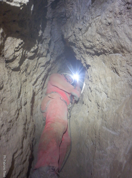 Io lo scendo mentre Luca aspetta su. Prendiamo i dati che servono e poi mi raggiunge. Dalla base del pozzo parte una diramazione che torna indietro. Visto che e’ alta e stretta stavolta mando avanti Luca a tirare la fettuccia, io intanto butto un occhio su quanto ha fatto finora. Benone, promette bene!