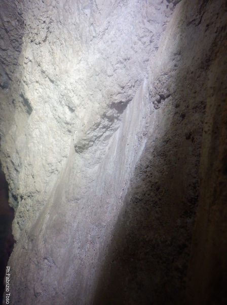 All’inizio del meandrino in lavorazione c’e’ una porzione di parete liscia con delle striature verticali. Dall’alto della mia ignoranzieta’ geologica azzardo un’ipotesi e la annuncio a gran voce: “ma questo e’ un piano di faglia!”. La cosa non riscuote gran successo tra i convenuti, ma io ne sono ugualmente soddisfatto.