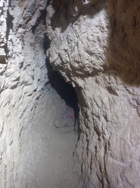Mentre facciamo i preparativi per uscire ricordo a Luca che deve prendere i punti di rilievo fino al fondo attuale e lui si mette prontamente all’opera. Gli do un minimo di assistenza, ma proprio un minimo. Una volta che lui ha terminato e si mette da una parte per aggiornare i dati del rilievo sul blocco note, io vado a curiosare e documentare con una foto il punto dove siamo arrivati.