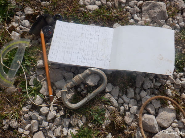 Ho deciso infatti, strada facendo, che e’ tempo che Luca impari a fare i rilievi in grotta. Faremo un rilievo “alla vecchia”, la bussola ce l’ho sempre appresso, al negozio quindi compriamo il resto, un blocco note, una matita, un rotolo di spago e un goniometro. Non avendo di meglio le misure le prenderemo con lo spago e col goniometro confezioneremo un clinometro alla buona.