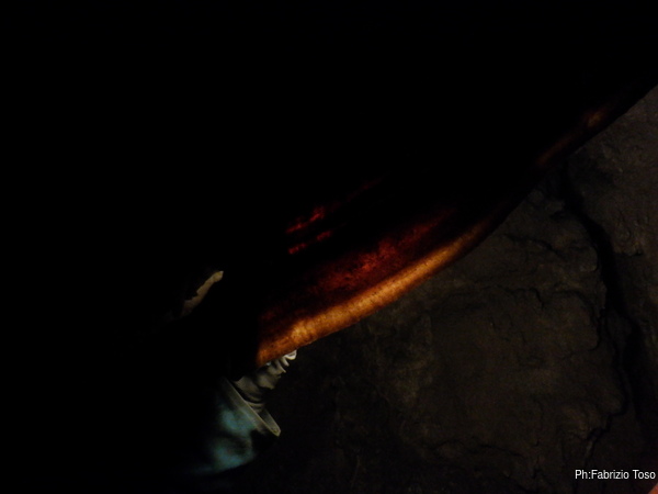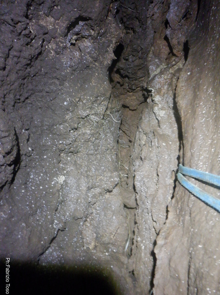 Per tutto il primo pozzo, e ora siamo almeno scesi di 25 metri rispetto all’esterno, c’e’ un fiorire di radici. Mi chiedo curiosamente quale sia la pianta cosi’ tenace da spingersi cosi’ in profondita’ alla ricerca di acqua.