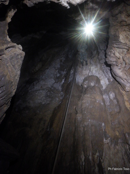 Proseguiamo l’ordinata discesa in fila indiana verticale. L’intensa luce sopra Mattia e’ Netta che ci segue chiudendo il serpentone.