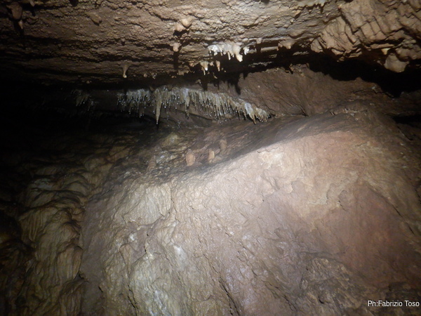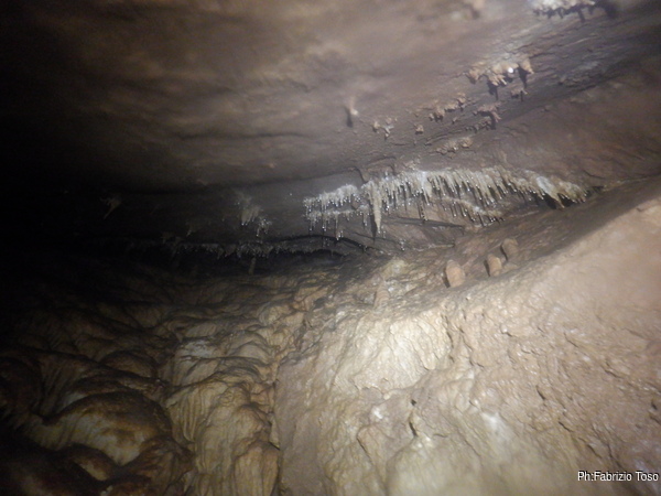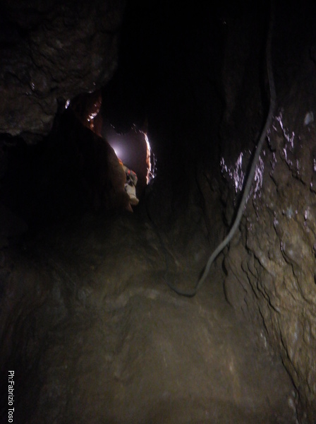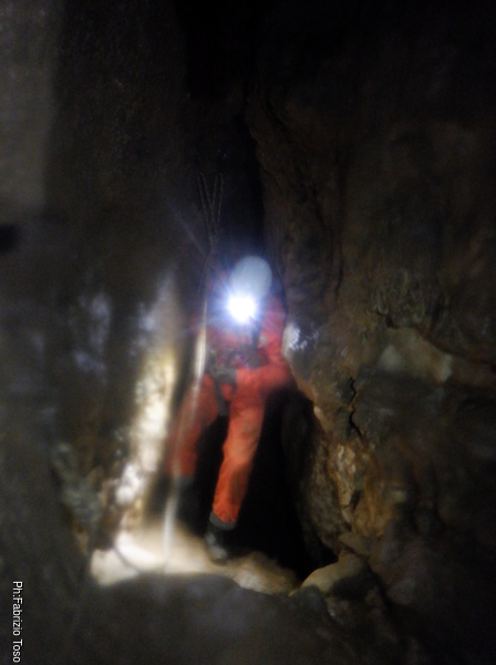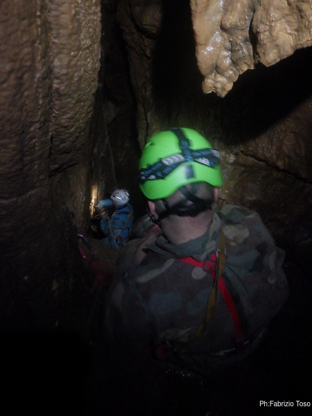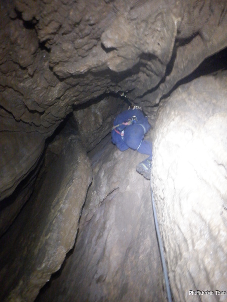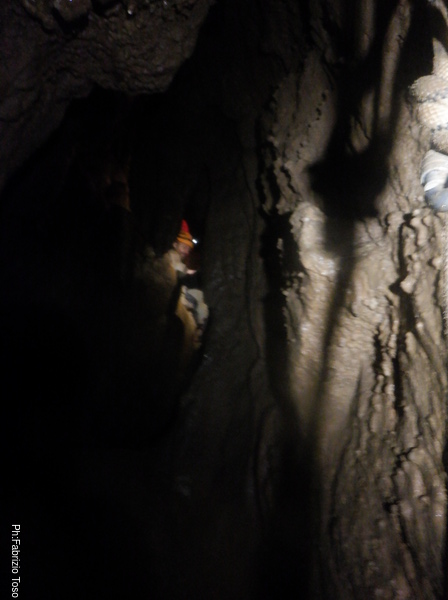 Fabio parte di nuovo per primo poi il serpentone speleo riparte con la stessa sequenza del pozzo precedente. Ora il nostri partono ad affrontare il pozzo successivo che parte con un passaggio stretto ma non eccessivamente scomodo.