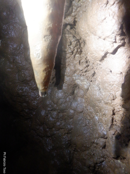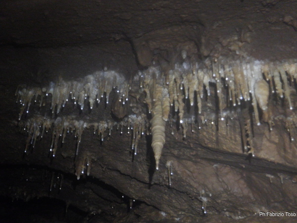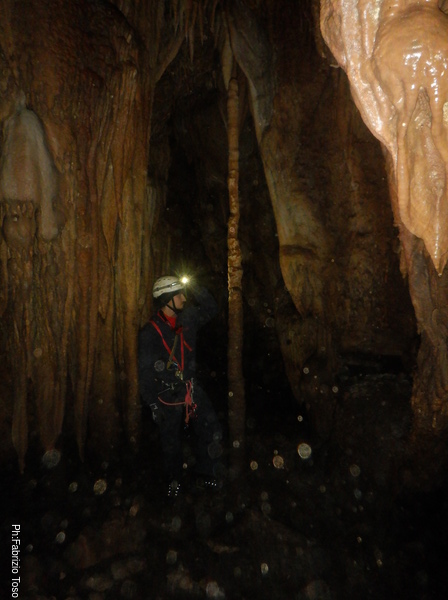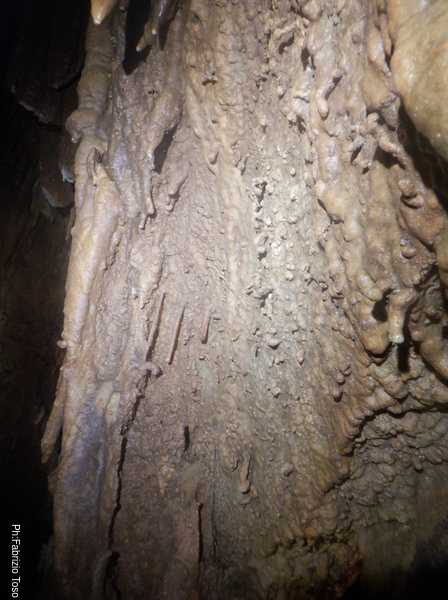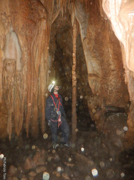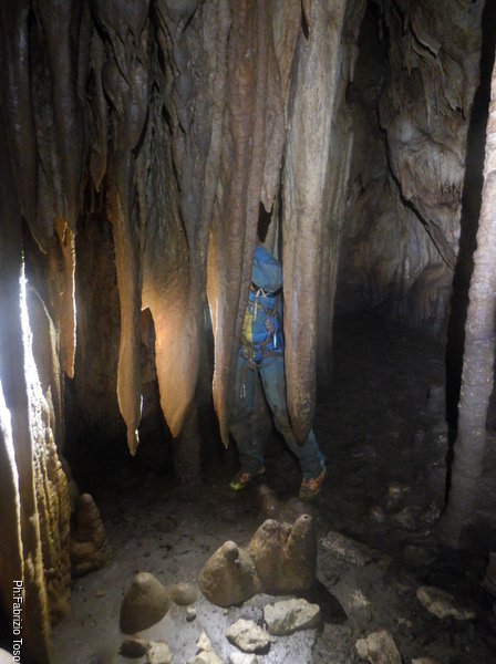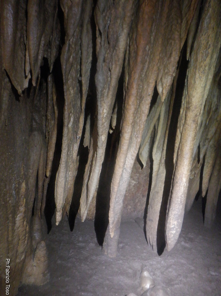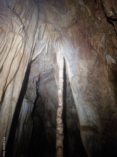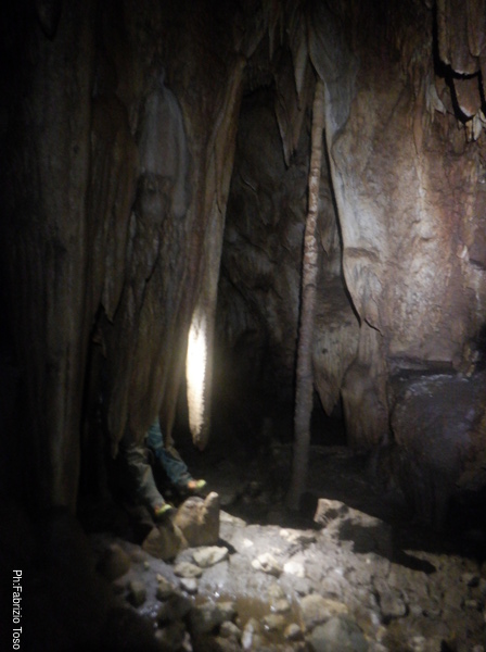 A un lato della sala c’e’ una gigantesca colata che quasi riempie la spaccatura che forma questa zona. Il soffito e’ festonato da stalattiti con la goccia d’acqua in fondo che sbrilluccicano alla luce delle mie lampade.