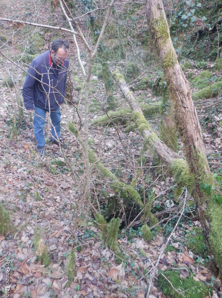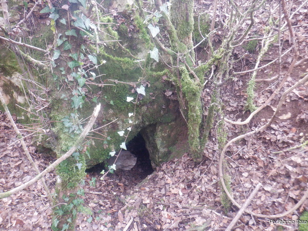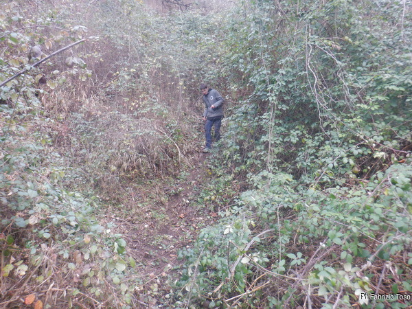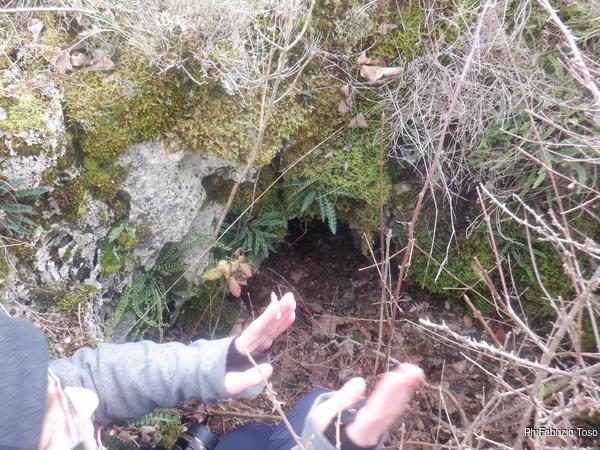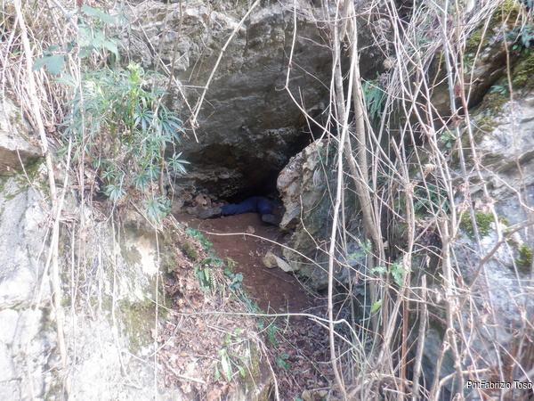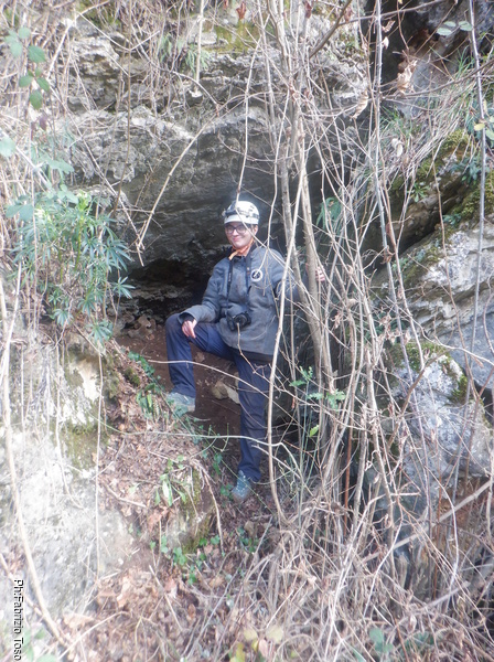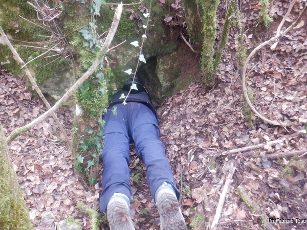 Naturalmente durante il tragitto incontriamo buchi piu’ o meno interessanti e ci fermiamo ogni volta per dar loro uno sguardo. Una di queste soste e’ quella giusta. Ci separiamo perche’ in pochi metri ci sono molti buchi interessanti. Quelli in alto li lasciamo alle cure di Aurora, noi guardiamo quelli facili a livello strada. Uno di questi attira la mia attenzione, si nasconde tra i rovi ma sembra inoltrarsi per qualche metro. Con attenzione libero il passaggio dai rami spinosi e andiamo a vedere da vicino.