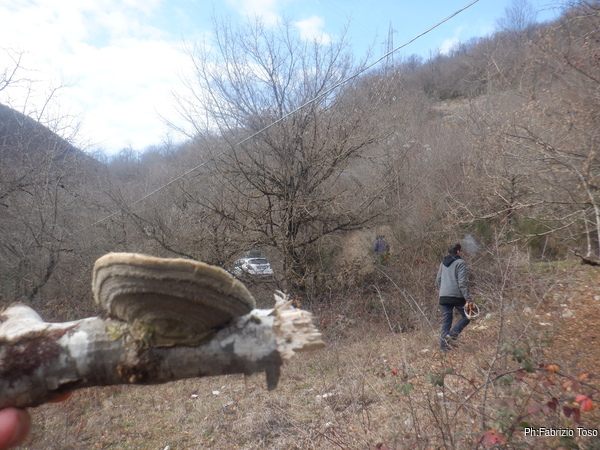 Torniamo all’auto, strada facendo trovo un ramo con un bel fungo e mi fermo per fotografarlo.