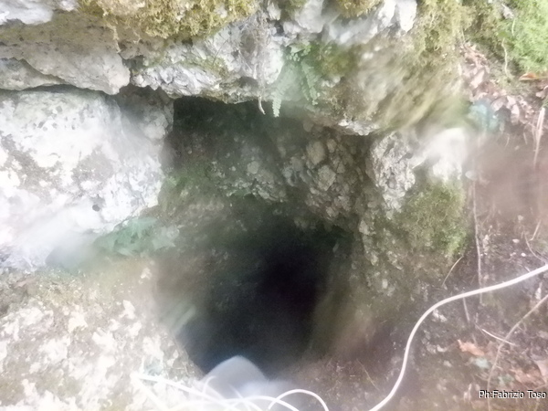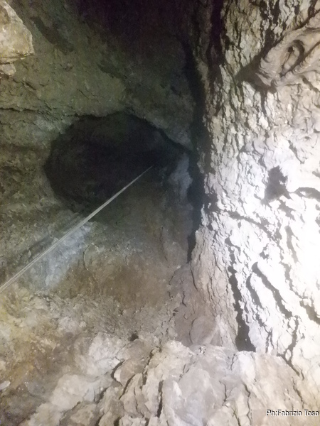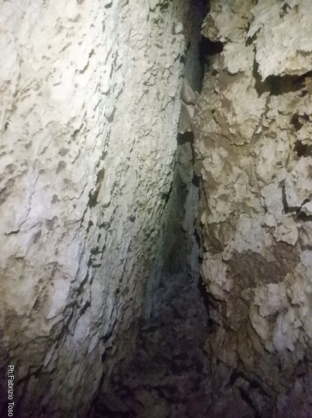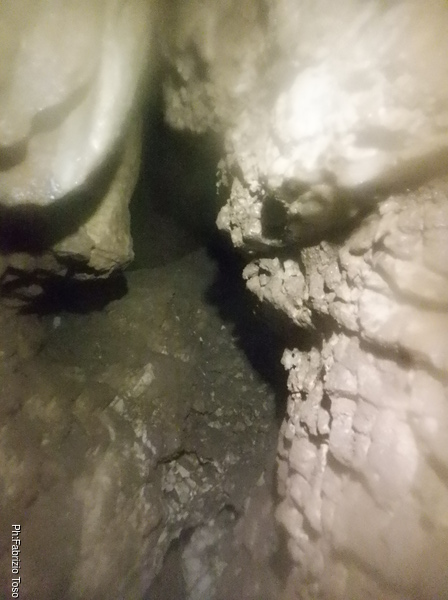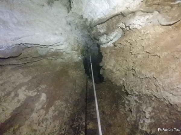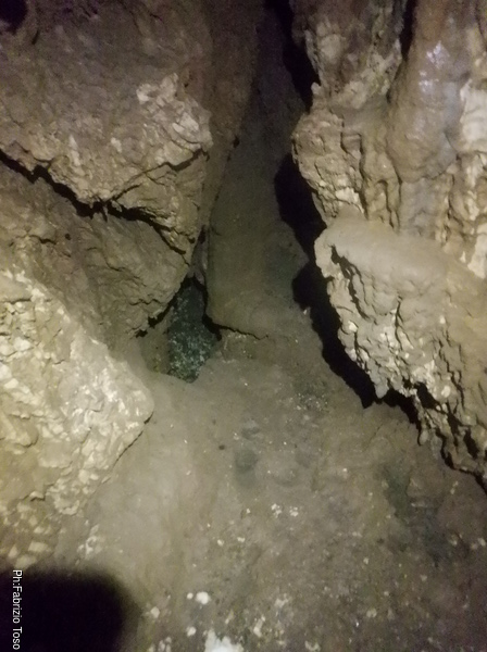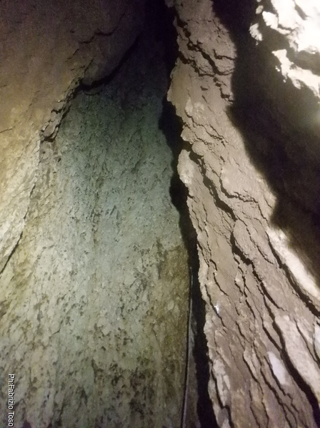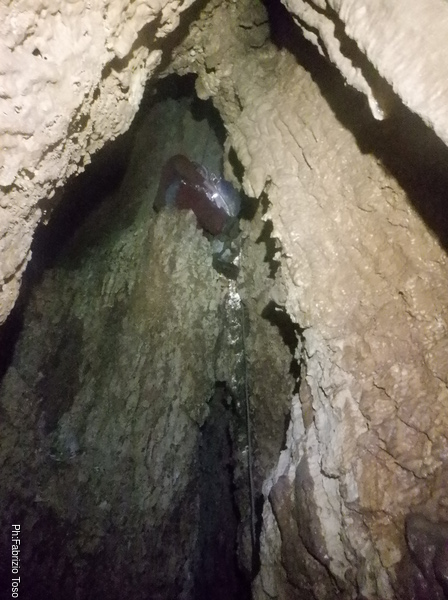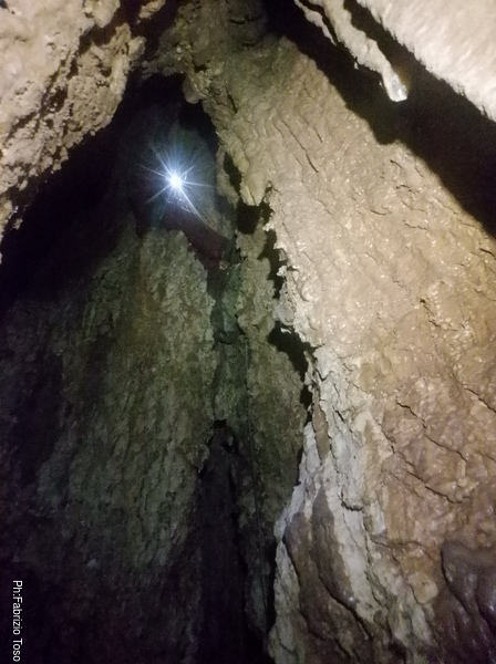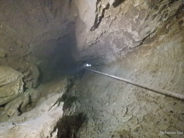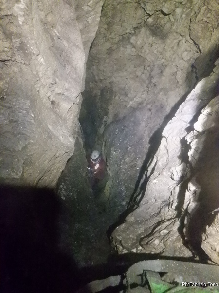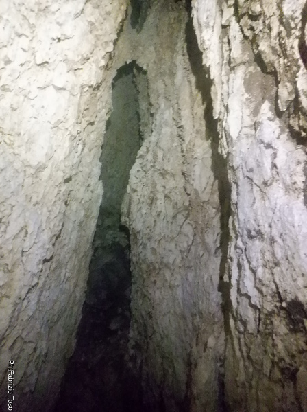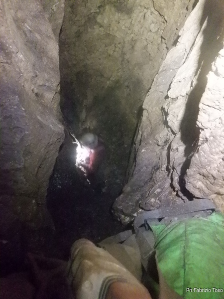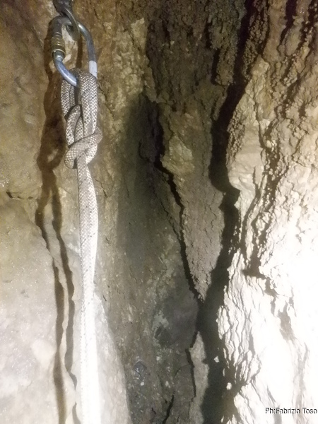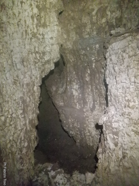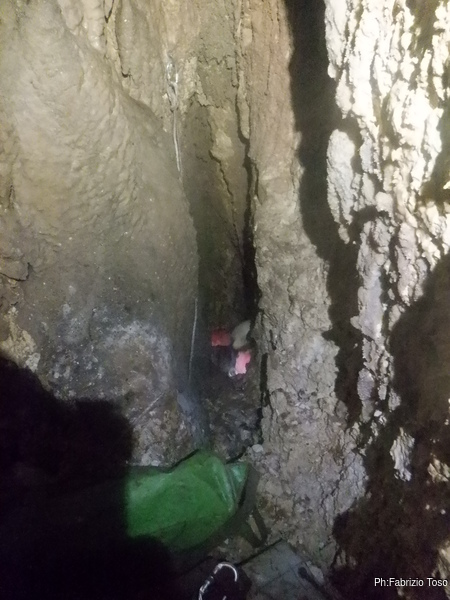 Con l’aiuto della corda del pozzo “lungo” vado finalmente a vedere la diramazione che abbiamo tralasciato finora. E’ una frattura che riprende la direzione della grotta e del pozzo “lungo” ma senza punti di comunicazione visibili. Cammino in salita lungo l’alta frattura per almeno una decina di metri fino a che la vedo stringersi inesorabilmente.