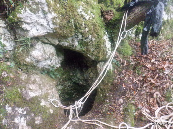 Quando Gabriele mi raggiunge, porta con se’ lo zaino con le corde, mi passa quella da 50m con cui armo il pozzo e subito inizio la discesa.