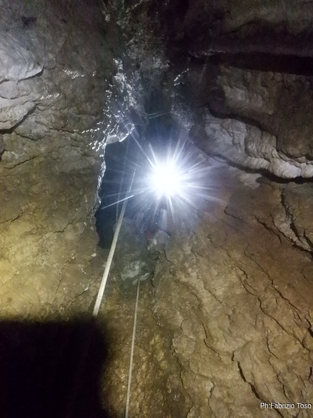 Questo che scendiamo e’ il pozzo piu’ lungo, da circa 25m con una cengia a due terzi della discesa.