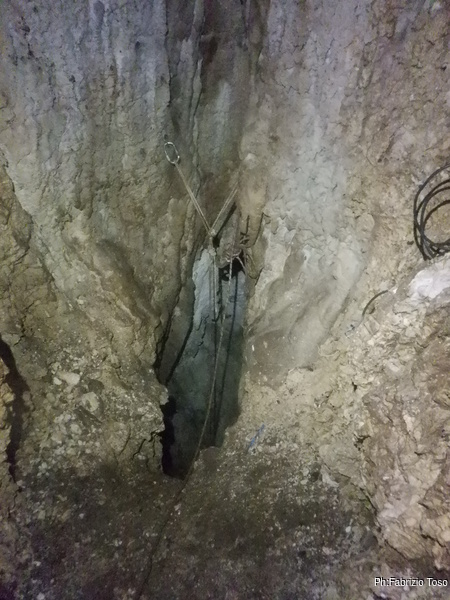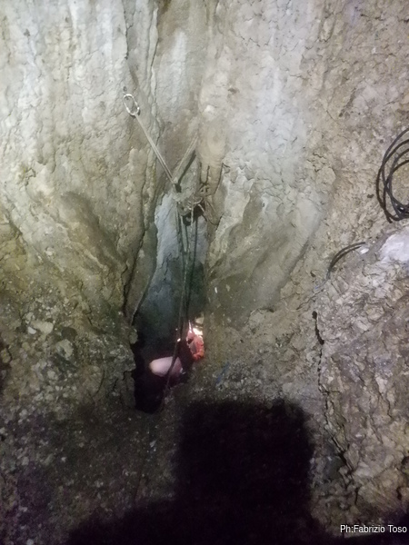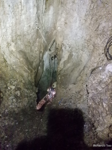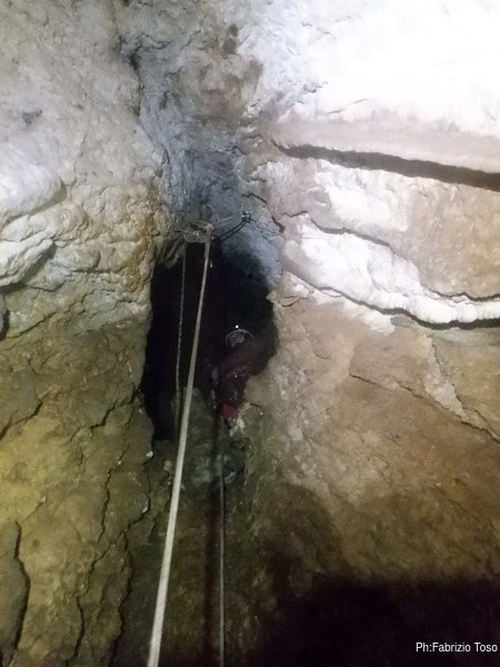 Quando la strettoia del pozzo sembra migliorata rimetto il demolitore al suo posto nello zaino e inizio a scendere. All’andata la gravita’ e’ d’aiuto e passo facilmente arrivando fino agli attacchi dove sistemare la corda e scendere. Purtroppo la 50m che ho utilizzato finora termina prematuramente e non potrei arrivare al fondo del pozzo. Per fortuna Gabriele nel suo sacco ha un’altra corda da 30m cosi’ me la passa e posso proseguire. Scendo il pozzo e urlo la libera a Gabriele.