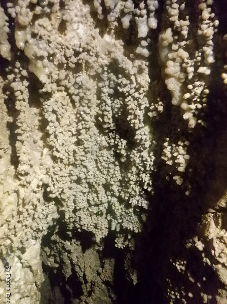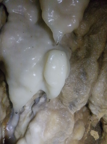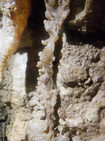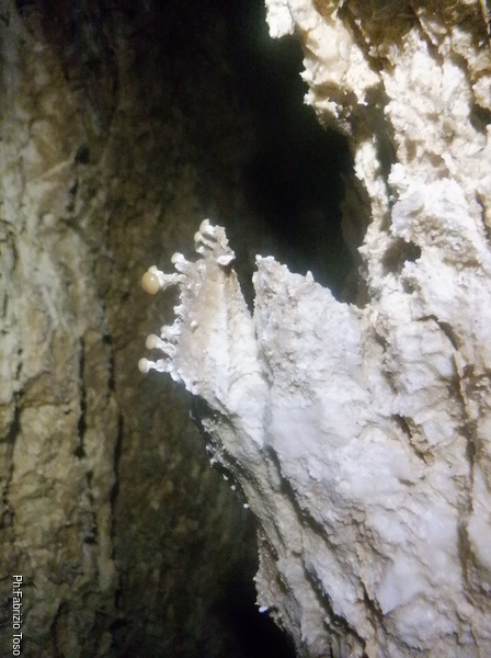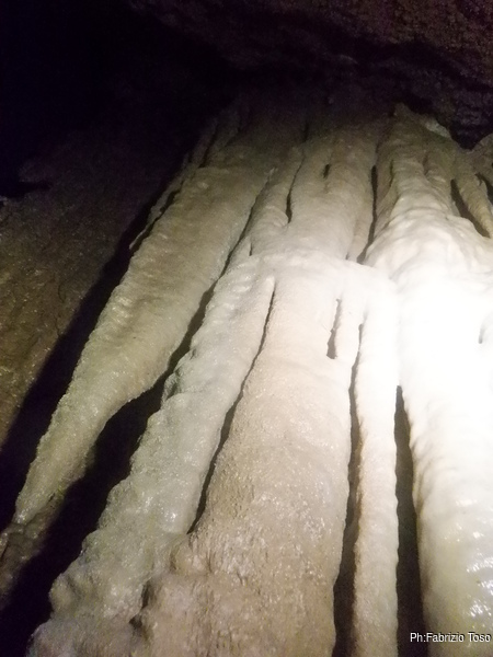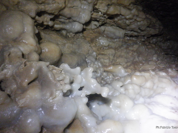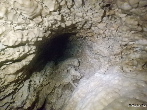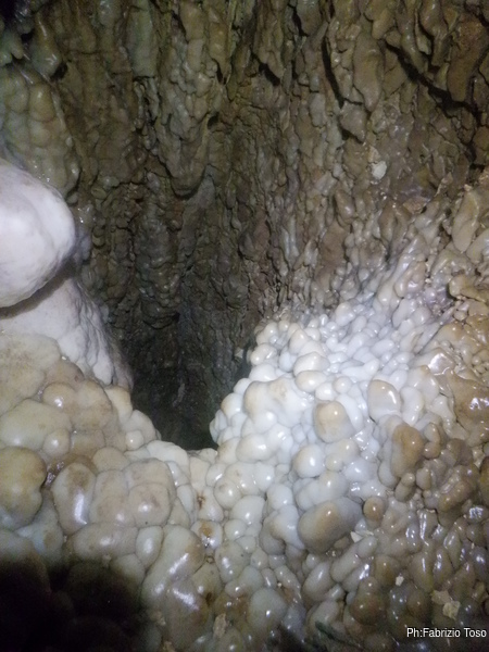 Cerco di muovermi senza sporcare troppo, infatti il pavimento della saletta e’ formato da concrezioni a “bolla” di un bel bianco candido con qualche variazione eccentrica ogni tanto.