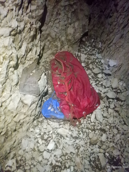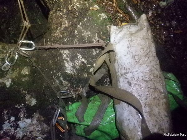 Alla base del pozzo, circa 7m di discesa, trovo i resti di precedenti esplorazioni. Sono degli zaini malridotti, provo a sollevarli ma sono pieni di fango e pesano qualche chilo. Oggi abbiamo gia’ abbastanza pesi. Li lascio dove sono con l’intenzione di prenderli la prossima volta quando, speriamo, saremo in piu’ persone.