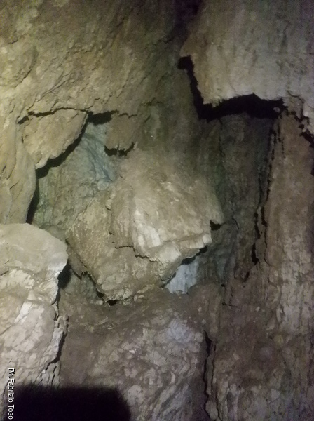 Prendo atto della sua decisione e lo lascio alle sue pene. Inizio a guardarmi attorno per trovare un armo naturale per poter, finalmente, scendere il pozzo successivo, con la speranza non sia l’ultimo. L’unica cosa utile che trovo e’ l’arco di roccia con la sigla “G.L.” di autori sconosciuti. Lego li’ la corda che viene dall’alto, passo sotto l’arco e vado avanti. Il primo tratto di un paio di metri in orizzontale per arrivare sulla verticale e’ abbastanza stretto. La corda struscia su uno spigolo di roccia che mi piace per nulla. Cerco di nuovo un qualcosa dove fare un razionamento o magari un deviatore ma trovo nulla. Alla fine decido…torno indietro a prendere la mazzetta e ne faccio buon uso.