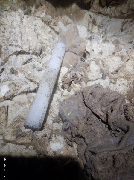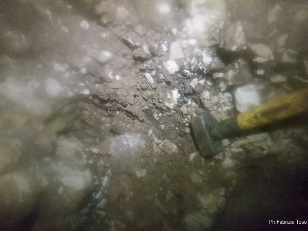 Scendo al meandrino fangoso. Il passaggio iniziale e’ strettino ma non impossibile. Subito dopo allarga un poco e dopo un metro gira a destra facendo quasi un tornante. Mi pare di intuire tracce di martellate ma non ho voglia di infilarmi nello stretto. Sul pavimento del punto comodo c’e’ tanta breccia mista a fango. Uno stretto pertugio potrebbe rivelare cose interessanti, provo ad allargare un poco a martellate ma alla fine rinuncio, non e’ lavoro da poco ed e’ meglio che ora ritorni da Gabriele.
