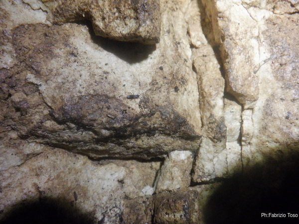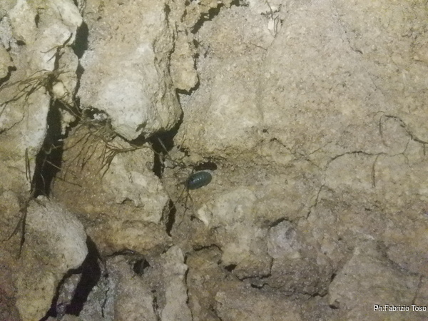 Non esco fuori perche’ piove a dirotto e fa ben piu’ freddo che qua dentro la grotta. Non avro’ molto spazio di manovra ma almeno non mi ghiaccero’. Mentre aspetto che Gabriele sistemi tutto per il recupero degli zaini faccio delle foto a qualche “bacarozzo” che mi tiene compagnia.