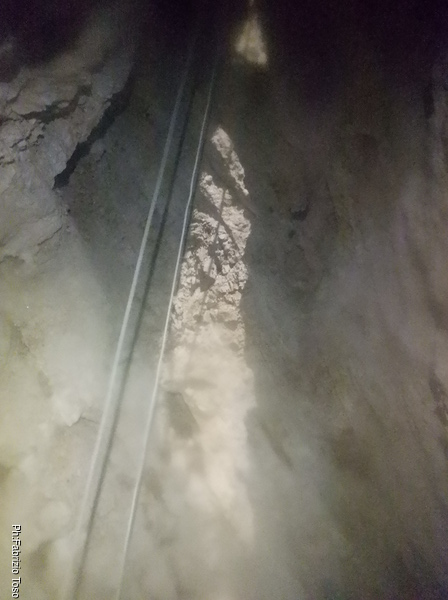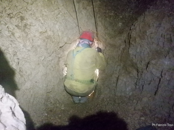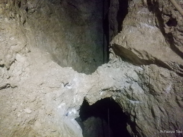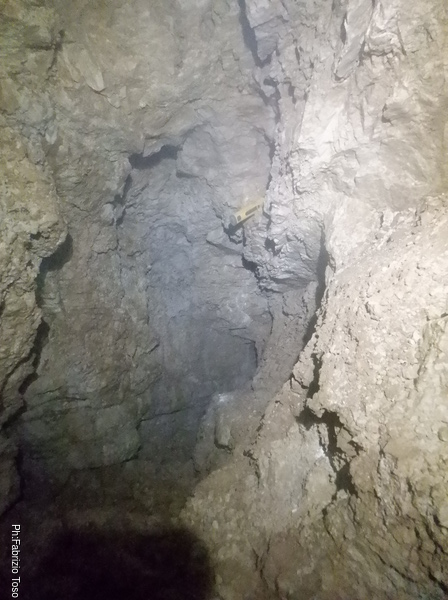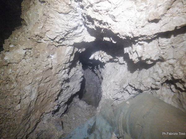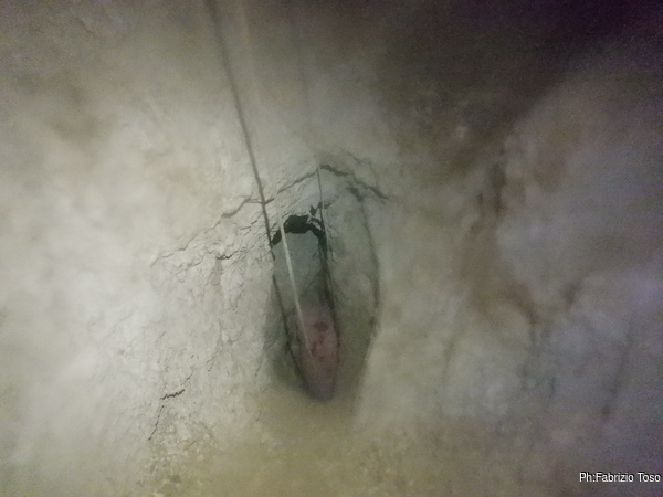 Mentre terminano di sistemare cose io vado avanti, tanto mi fermero’ appena sotto il primo pozzo. Devo distruggere un arco di roccia che disturba assai la progressione. Aspetto alla base del pozzo. Nerone passa e va avanti verso il fondo attuale.