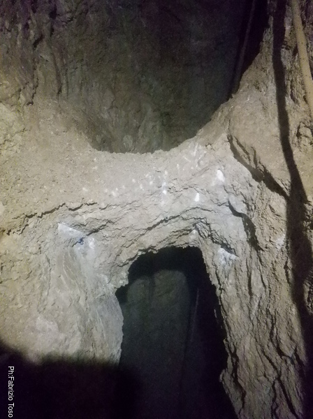 Inizio a lavorare col demolitore in corrispondenza del pozzetto ma non riesco a combinare nulla. Trovo un possibile bypass un paio di metri prima e provo anche la’. Riesco ad allargare la partenza ma poi piu’ avanti non riesco a scendere. Quando termina anche la seconda batteria del demolitore torno indietro dai miei amici.