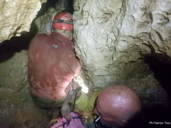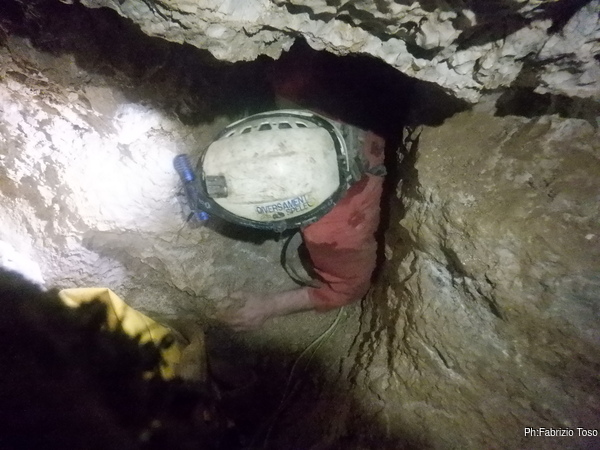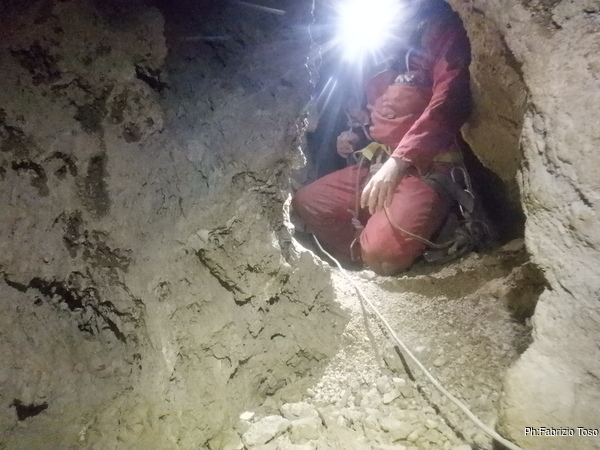Tarcisio e Nerone stanno lavorando sodo per rendere comodo il passaggio del tratto di meandro successivo. Io pero’ gia’ ci passo, quindi vado avanti a vedere. Dopo una decina di metri scarsi arrivo in una zona piu’ larga con molti arrivi. In fondo nemmeno a dirlo restringe e si intuisce un saltino di meno di due metri.
