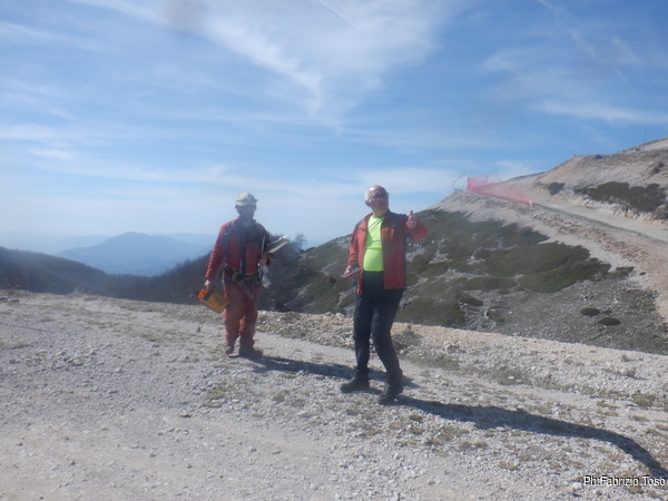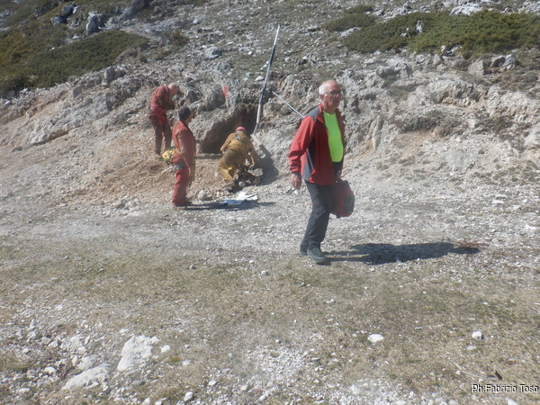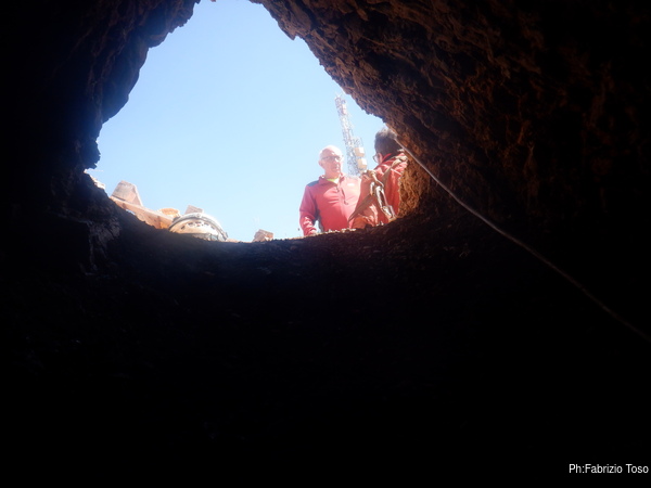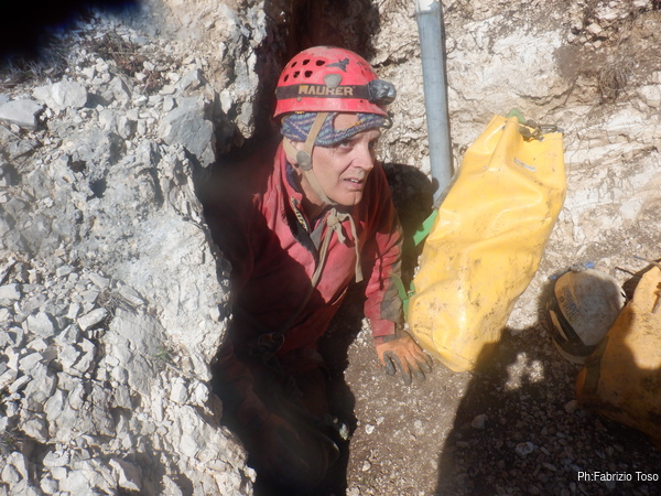 Dichiarato defunto il demolitore elettrico la decisione e’ presto presa. Si esce. Facciamo il materiale e lo riponiamo negli zaini. Parto per primo. In pochi minuti sono in vista dell’esterno dove trovo Gabriele che chiacchiera con Patrizio, arrivato per un saluto.