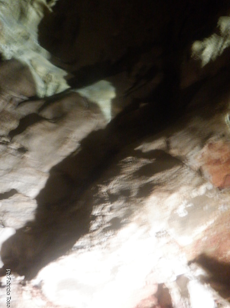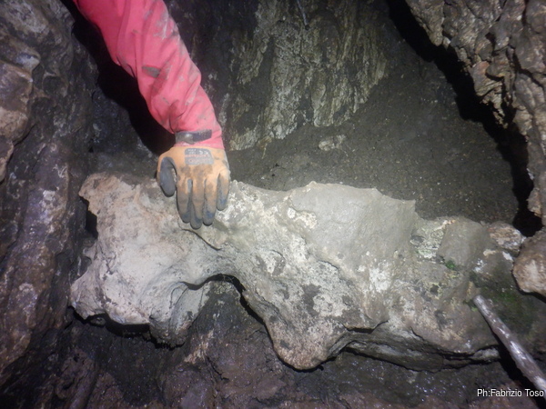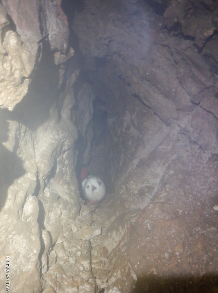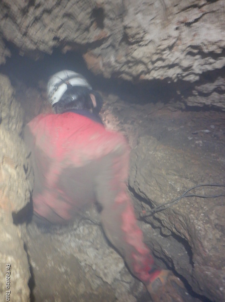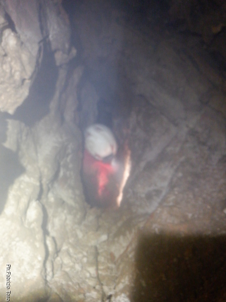 Appena arrivo trovo una sorpresa, un pietrone di rispettabili dimensioni e’ caduto giu’ da chissa’ dove e per nostra fortuna si e’ fermato poco prima del budellino in cui prosegue la grotta dopo la saletta. Con un poco di fatica Luca ed io riusciamo ad incastrarlo in una posizione abbastanza stabile prima di proseguire.