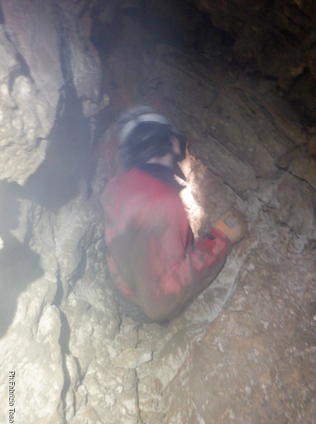 Col solito passaggio dello zaino tramite corda arriviamo fino in zona scavo dove ci mettiamo subito all’opera. Inizio io poi dopo un’oretta cedo il posto a Luca. Documento la sua entrata nel cunicolo dove c’e’ il fronte di scavo.