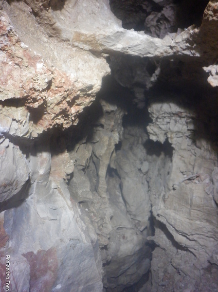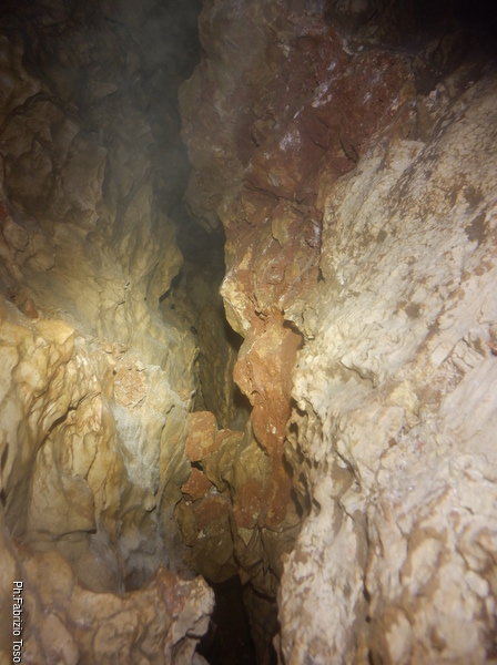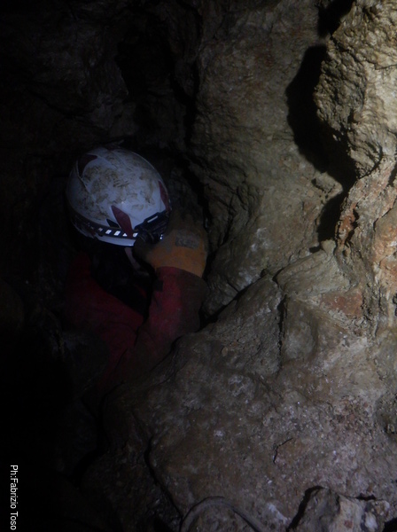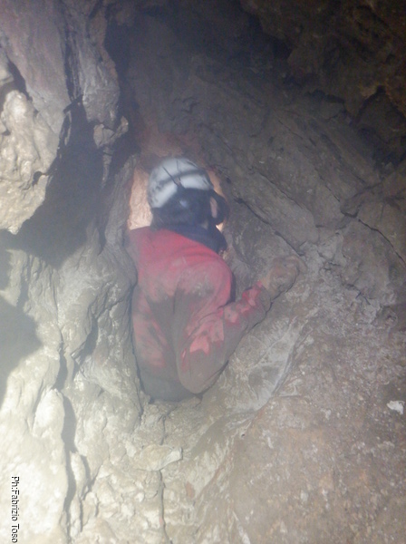Inizio a pensare che Bucio Nero’ ha rotto seriamente le scatole ma proprio in quel momento Luca riesce a farsi abbastanza avanti da guardare avanti. Gli sembra che un metro circa avanti a lui lo spazio si allarga un po’, vede anche una colata di calcite bianca immacolata. Ho capito, dovremo continuare lo scavo.