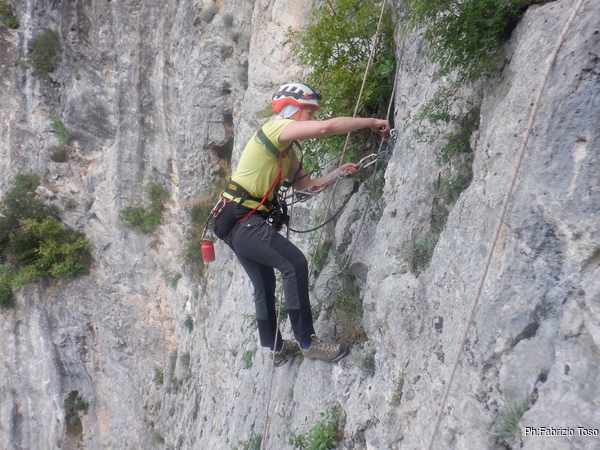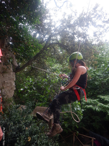 Tra i vari esercizi c’e’ anche l’equivalente del “ponte tibetano”, il passaggio della “V” dove si scende da un lato della corda e si risale dall’altro facendo attenzione a non intricarsi tra corda e attrezzi. Un buon esercizio per affinare il coordinamento nell’utilizzo della attrezzatura.