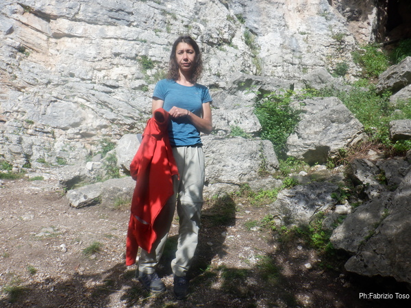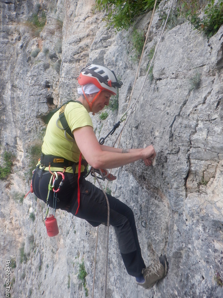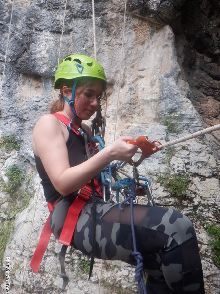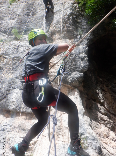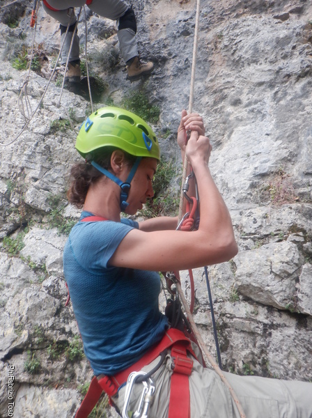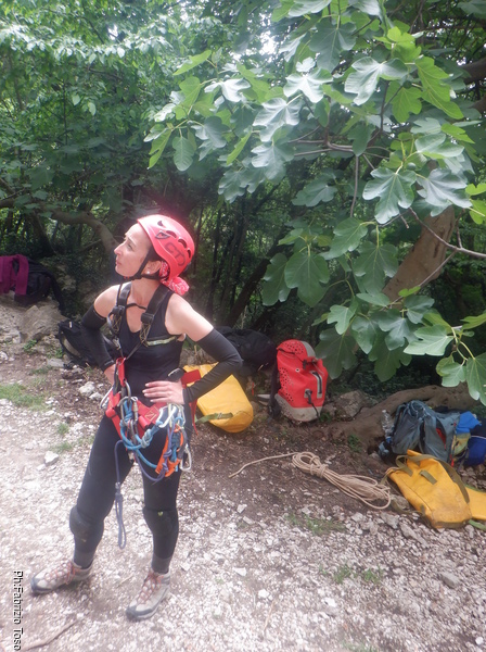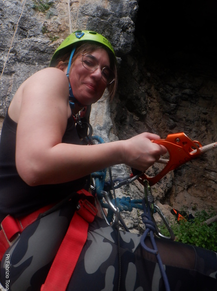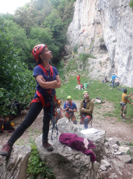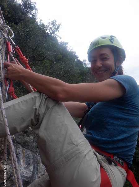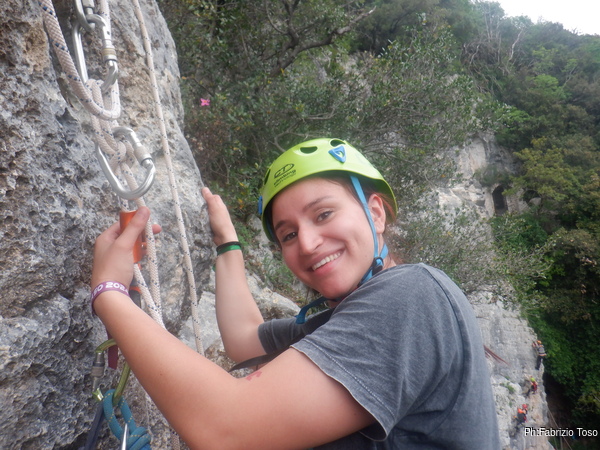 Diletta che si diletta su corda con sguardo audace di sfida all’impervia parete e al fotografo che la importuna in questo momento delicato.