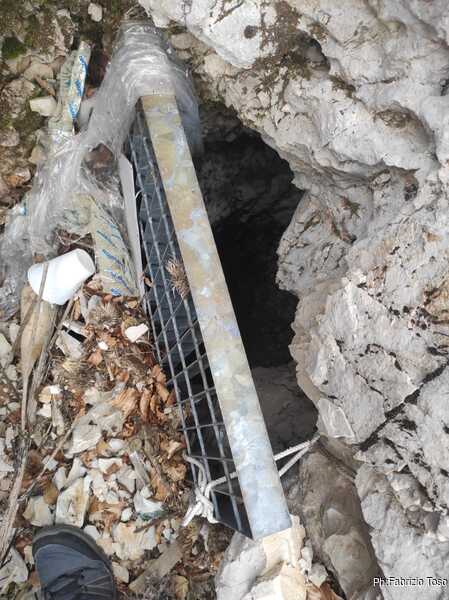 Da vicino ne ho la conferma, l’ingresso e’ quasi ostruito da un mucchio di sassi e pattume vario. Forse la grotta si e’ salvata grazie alla grata che lasciammo l’ultima volta. Volendo andare a verificare com’e’ la situazione all’interno ci sara’ da fare un bel lavoro di pulizia prima di poter accedere.