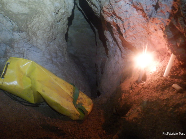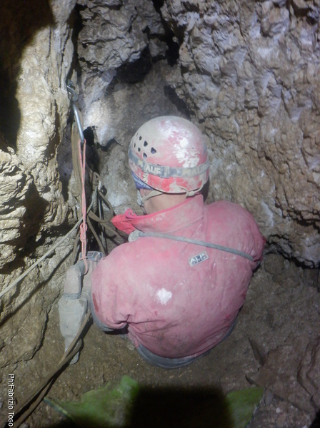 Ci sistemiamo per lavorare ed esplorare. Per prima cosa chiedo a Luca di tentare il passaggio stretto sulla destra. Lui pazientemente prova entrando piedi in avanti ma e’ troppo stretto anche per lui. Entra anche di testa per vedere se il cunicolo centrale e quello dov’e’ infilato lui sono collegati ma quando mi incastro in quello centrale per illuminare in avanti lui non riesce a vedere la mia luce quindi, anche se mi sembra improbabile, per ora devo concludere che non sono collegati.