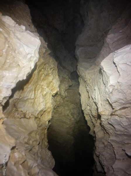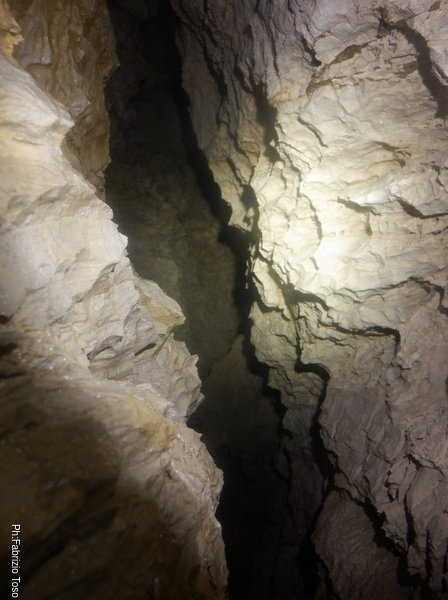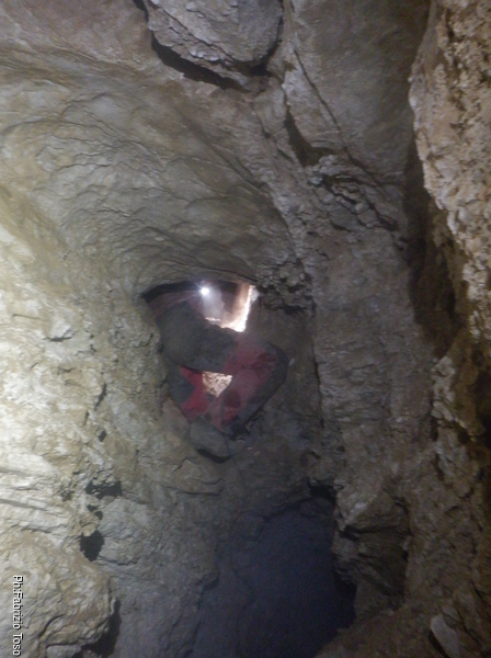 In pratica davanti a noi si palesa un saltino. Luca prova a incunearsi nel passaggio appena creato. E’ strettino ma il saltino risulta scendibile anche senza corda. Una volta giu’ non sembra esserci molto spazio ma Luca scopre un paio di cose interessanti. Il cunicolo di destra e quello centrale nonostante le prove precedenti con la luce sono effettivamente collegati, come mi sembrava. Inoltre dal lato opposto al saltino il meandro sembra proseguire.
