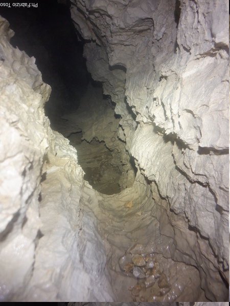 Come stabilito Luca libera la corda poi risale e resta vicino a me per darmi una mano alla bisogna. Io mi posiziono alla partenza del primo pozzo e aspetto che Tarcisio e Nerone passino per andare al fondo, anzi approfitto del loro passaggio per studiare dove si incastrano di piu’ e vedere dove allargare. Quando finalmente sono passati e non rischio di tirar loro addosso dei sassi inizio a lavorare col demolitore per allargare la partenza del pozzo e rendere meno ostica l’uscita al ritorno.