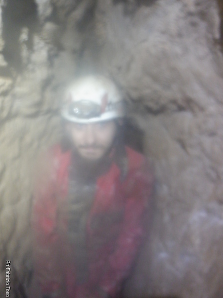 Ecco il nostro prode esploratore in un momento di nebbia. Si, a tratti si forma un bel nebbione, perche’ la grotta respira, a momenti soffia aria ghiacciata, a momenti aspira e in altri ancora rimane in stallo avvolgendoci in questa nebbia incomprensibile.
