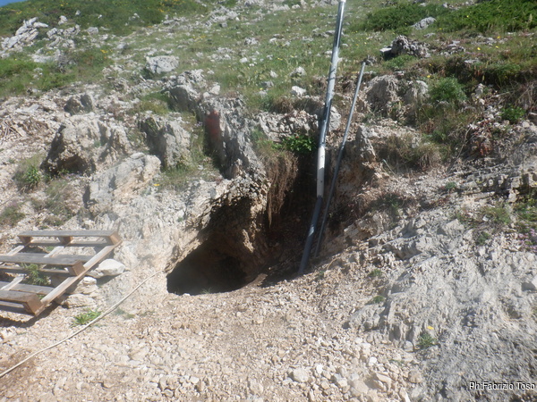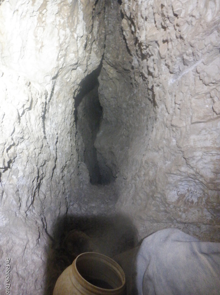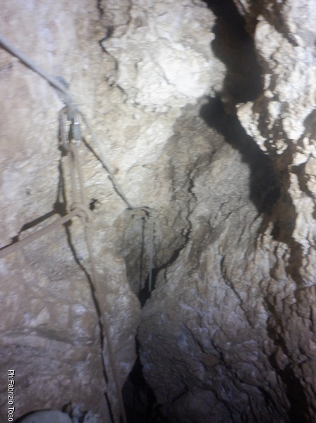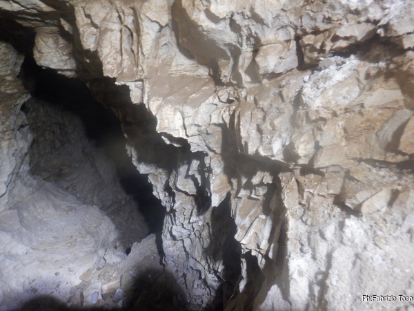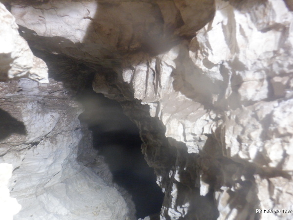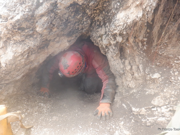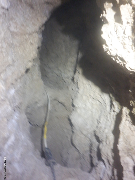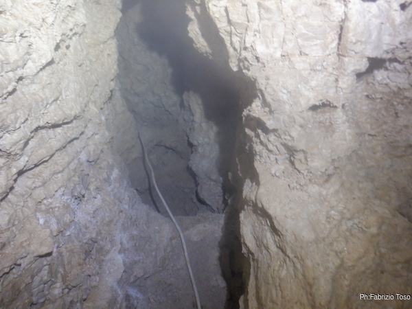 L’ambiente non e’ grande ma almeno posso stare in piedi, cosa gia’ notevole. C’e’ un altro pozzetto, questo e’ abbondantemente largo, e’ almeno di 30 centimetri e scende almeno di 5 metri. Lo guardo sconsolato perche’ a prima vista non mi sembrano esserci altre vie e solitamente l’allargare uno spazio in discesa e’ un lavoro lento e faticosissimo.