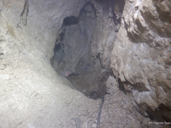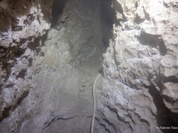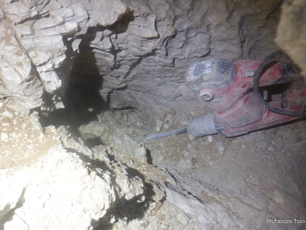 Dopo aver provveduto a un sicuro ritorno cerco di ricavarmi un poco di spazio per potermi muovere piu’ agevolmente. Inizialmente devo tenere la punta del demolitore vicina al corpo, ma la roccia decide di collaborare e in qualche minuto riesco a girarmi e osservare la prosecuzione.