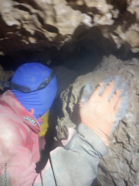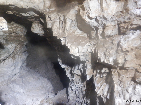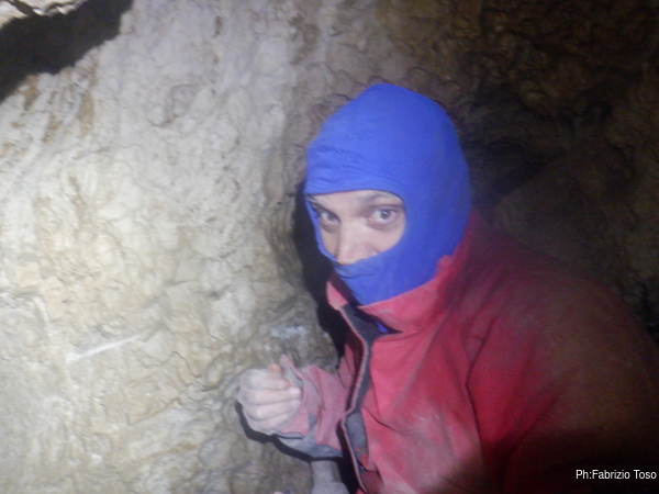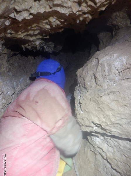 Il vuoto sotto di me forse era un pozzo ma uno di quelli stretti non piu’ di 20 centimetri. Ora e’ parzialmente ostruito dalle rocce che mi ostacolavano fino a poco fa. Di fronte a me la grotta prosegue ma naturalmente con una leggera curva a sinistra che al momento, date le scarse possibilita’ di movimento non mi permette di vedere oltre.