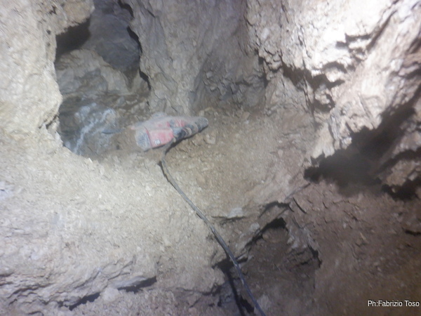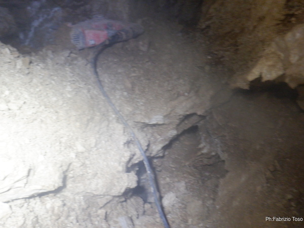 Con qualche difficolta’ riesco a portare tutto il necessaire al di la’ del meandro ed inizio subito a lavorare. Nerone inizia la sua parte e per un po’ restiamo impegnati e senza comunicare. Durante una pausa Nerone mi urla di fare una pausa ogni tanto cosi’ posso sentire se lui ha qualcosa da dirmi. Da quel momento cerco di rispettare le “pause comunicative”, cosi’ che anche il demolitore possa avere una breve tregua.