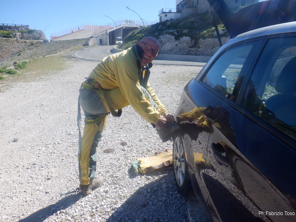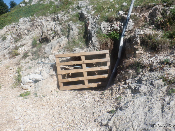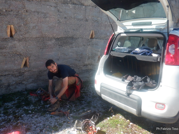 Io passo il tempo facendo foto quasi inutili e poi per tornare indietro a prendere una batteria carica per il trapano…ancora non serve ma penso servira’. Subito dopo torno al saltino impestato per bere un goccio d’acqua e controllare se li abbiamo uno scalpello. Non lo trovo e ritorno con le pive nel sacco.