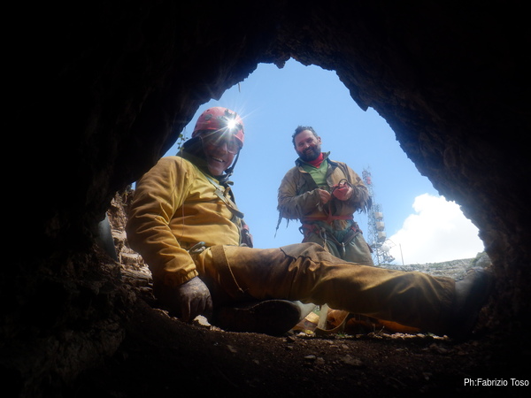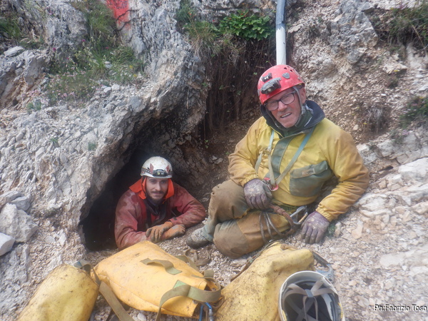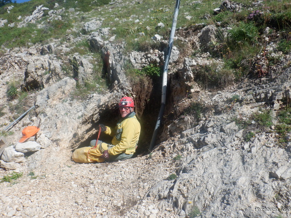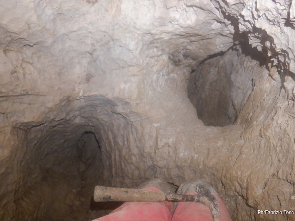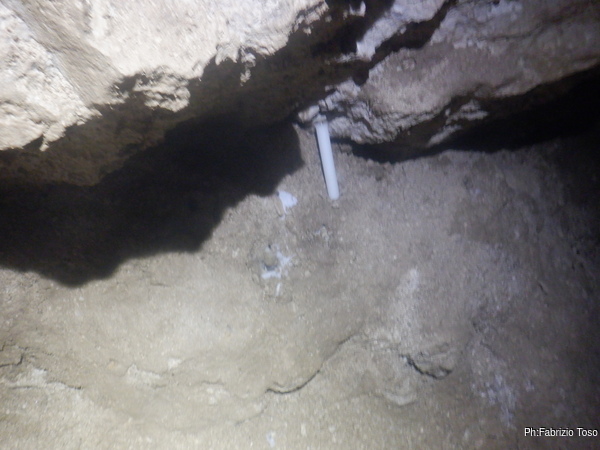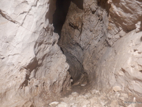 Lo spazio non e’ tanto, pero’ prima della zona di scavo odierna c’e’ una minuscola saletta che sul pavimento ha dei pozzi che vanno chissa’ dove, troppo stretti per poterci togliere la curiosita’. Nella ore seguenti ci alterniamo spesso allo scavo per non distruggerci troppo. Alla fine decidiamo di aver allargato abbastanza e Luca, il piu’ smilzo del gruppo, tenta il passaggio con Tarcisio che gli fa assistenza.