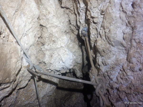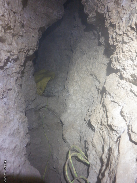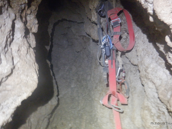 Arrivo alla partenza del pozzo. Impiego del tempo a trovare un posto buono per montare un secondo attacco ma alla fine riesco. Sistemo la corda e posso scendere a raggiungere i miei amici.