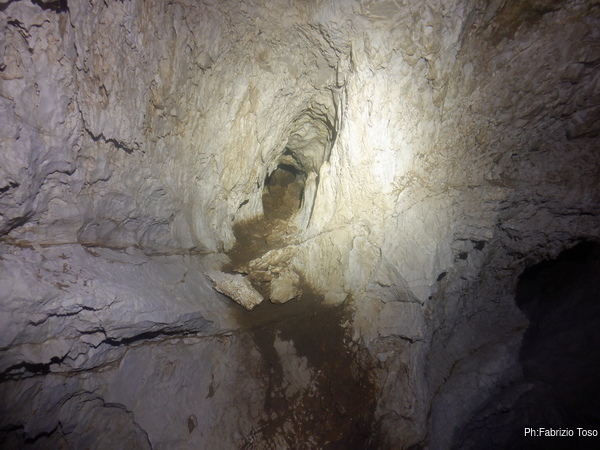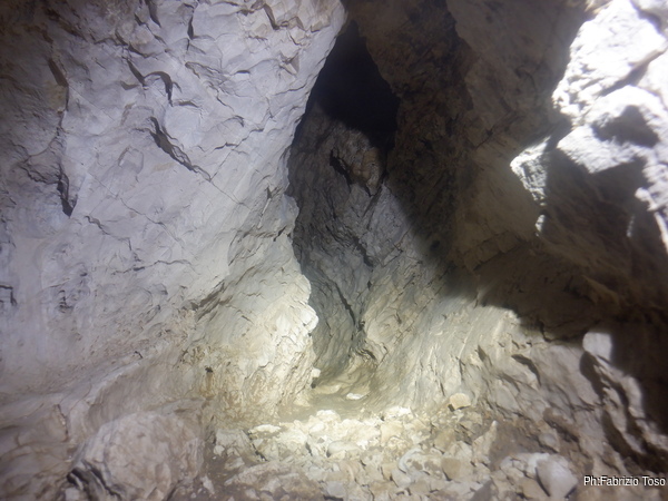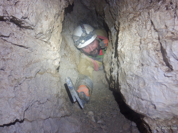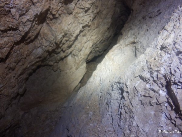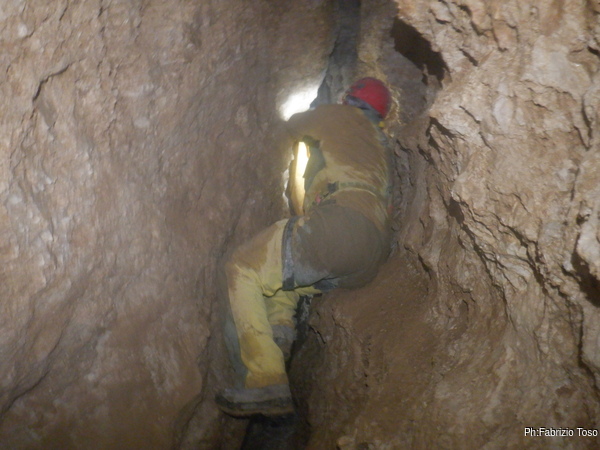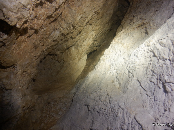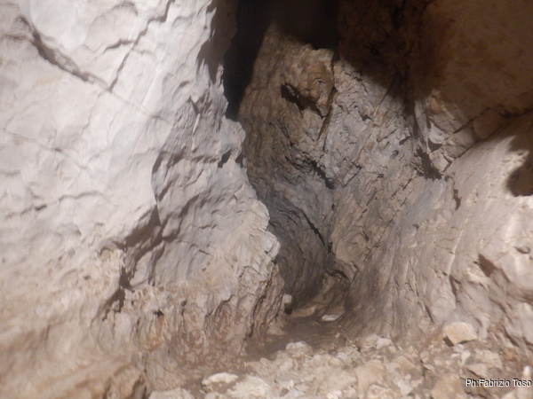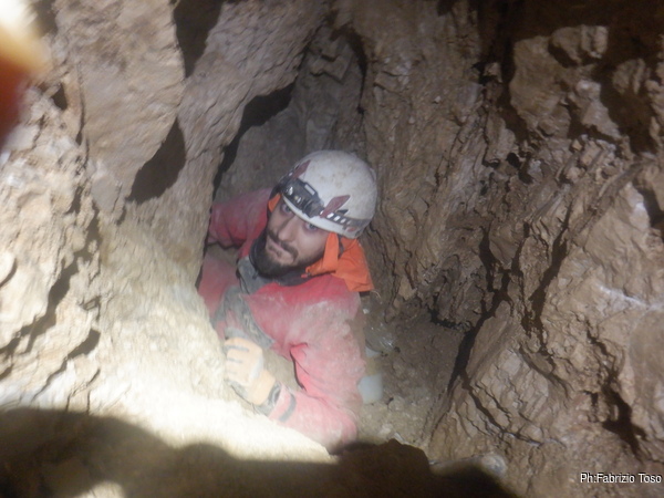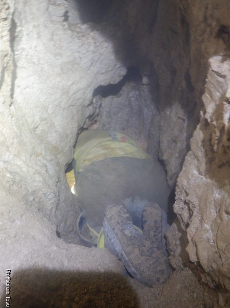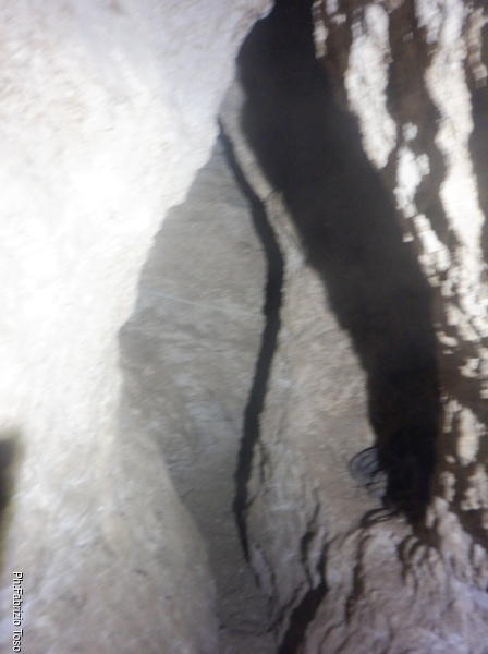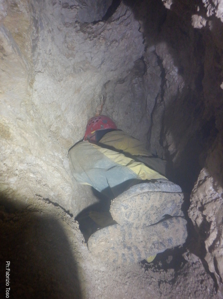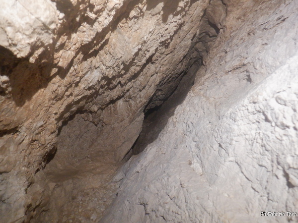 Durante la mia breve assenza Luca passa la strettoia appena allargata e, come prevedevo, la batteria del trapano si e’ esaurita e l’hanno cambiata. Luca e’ arrivato in una ennesima, minuscola sala. Gli chiedo se ci sia posto anche per me e se la strettoia sia praticabile anche da me che sono piu’ corpulento di lui. La risposta e’ si ad entrambe le domande quindi faccio a scambio di posto con Tarcisio e mi avventuro.