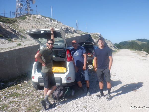 Oggi una bella novita’, insieme a Luca e’ venuto un suo amico per provare ad andare in grotta. Eccoci al parcheggio vicino la grotta per una foto di benvenuto con Luca, Nerone e Alessio.