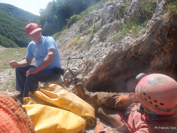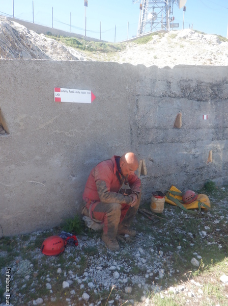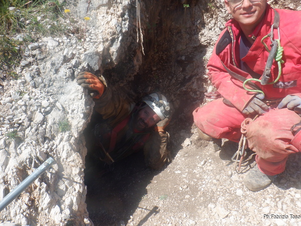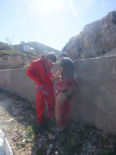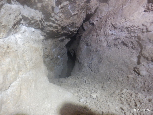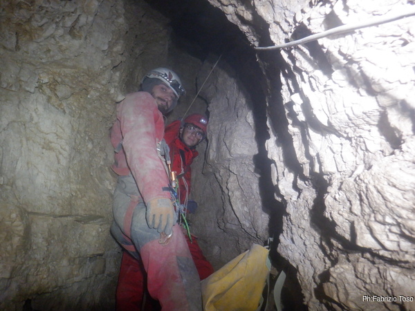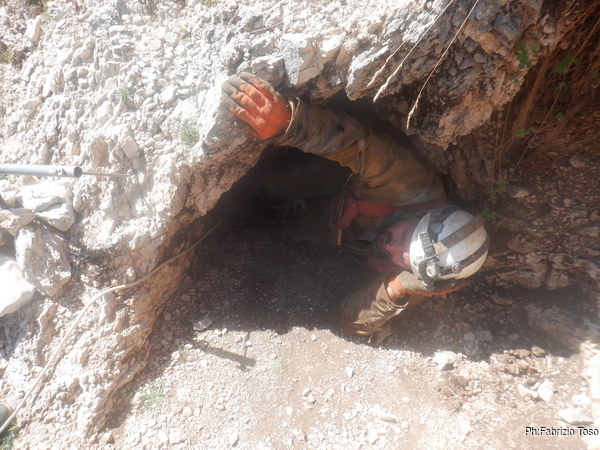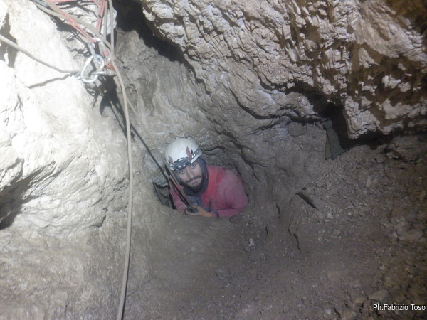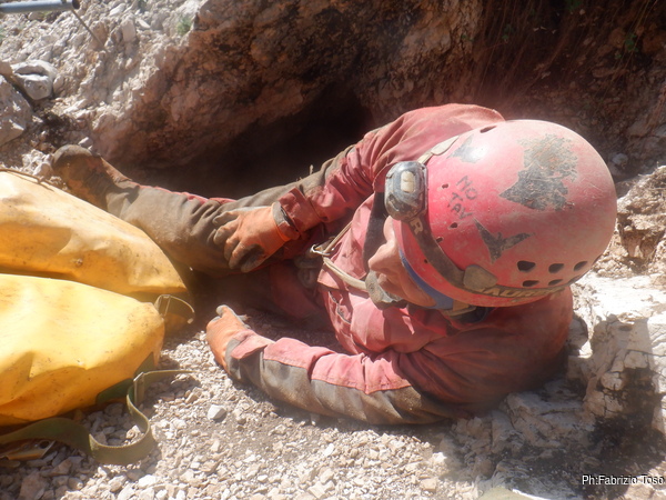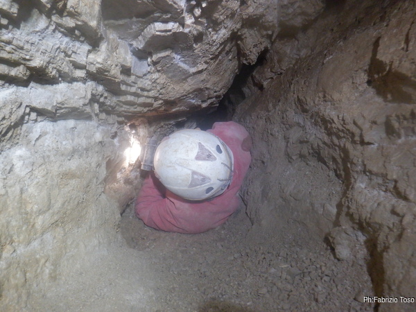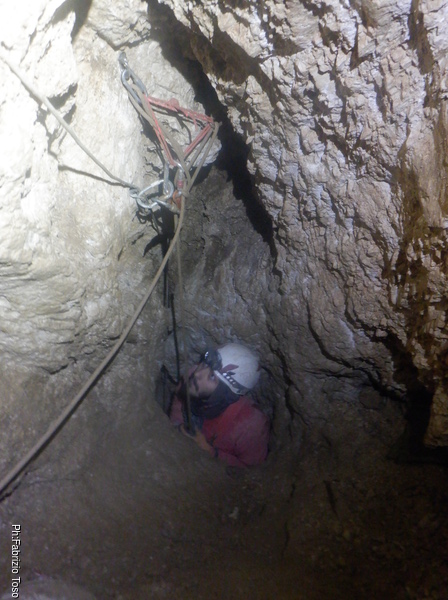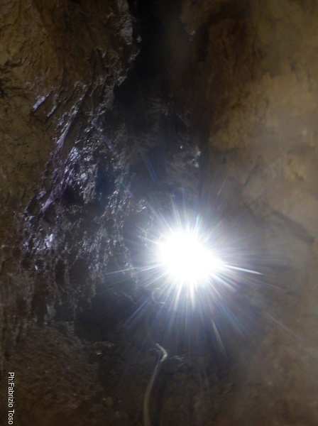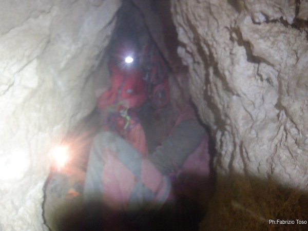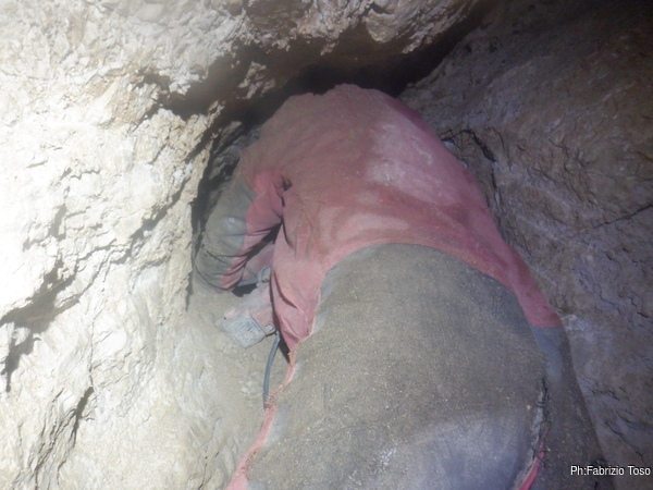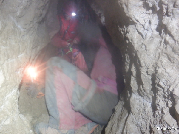 Stringendoci un poco facciamo scendere Luca per andare a verificare il passaggio. Nulla da fare, troppo stretto. Nerone si dichiara stanco e poi, dice che il trapano sta scaldandosi troppo, rischiamo di fonderlo, e’ meglio sospendere il lavoro.
