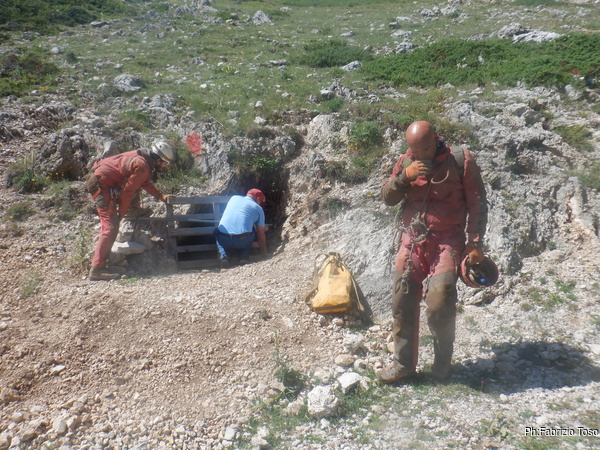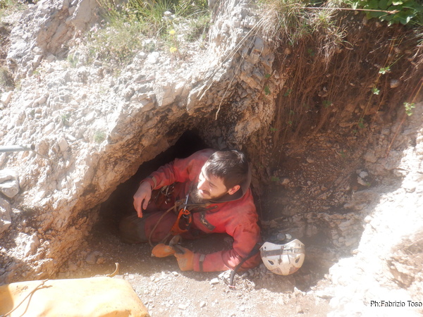 Quando torno, molto soddisfatto, alla grotta trovo ancora nessuno. Visto il gran caldo decido di iniziare a scendere il primo tratto. Scendo cosi’ come sono, mezzo vestito, tanto prima del pozzo c’e’ spazio e fresco adatti a terminare di indossare l’imbrago e il resto della ferraglia senza soffrire troppo.