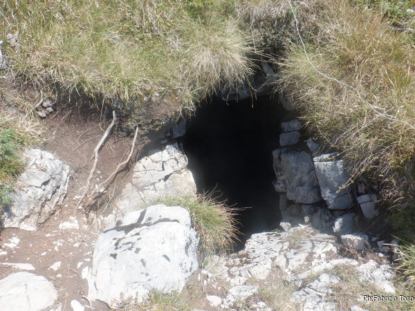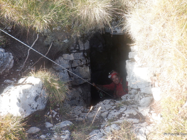 O meglio, Giuseppe parte, Fabio si attarda leggermente al rifugio per i preparativi e io faccio avanti indietro piu’ volte perche’ mi scordo pezzi. Alla fine riesco ad avere con me tutto il necessario e raggiungo Giuseppe all’ingresso della grotta.
