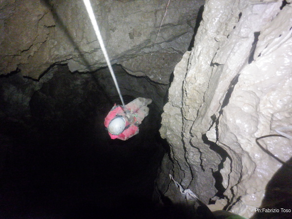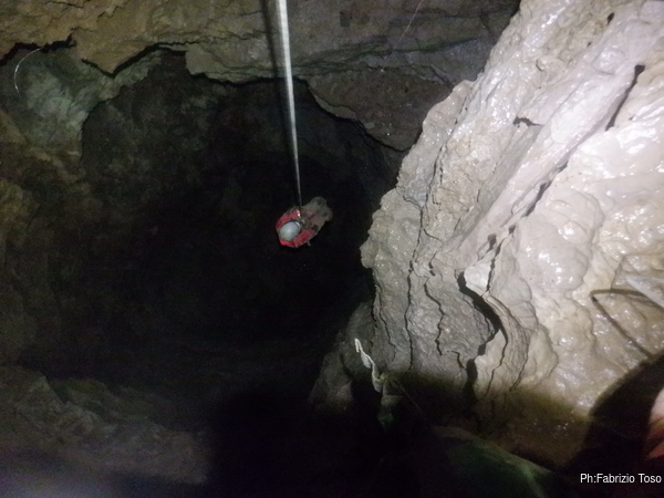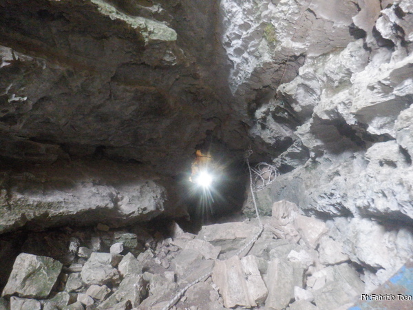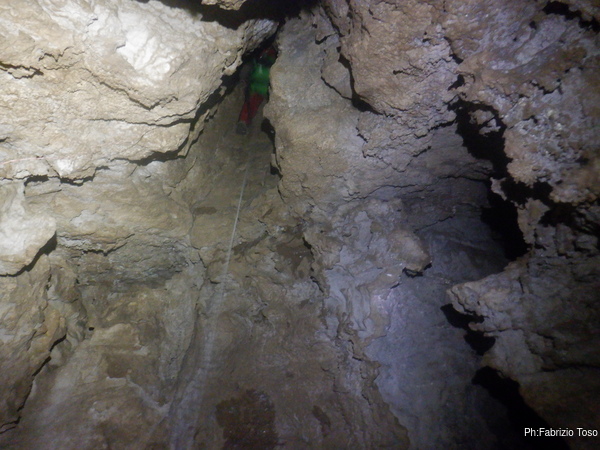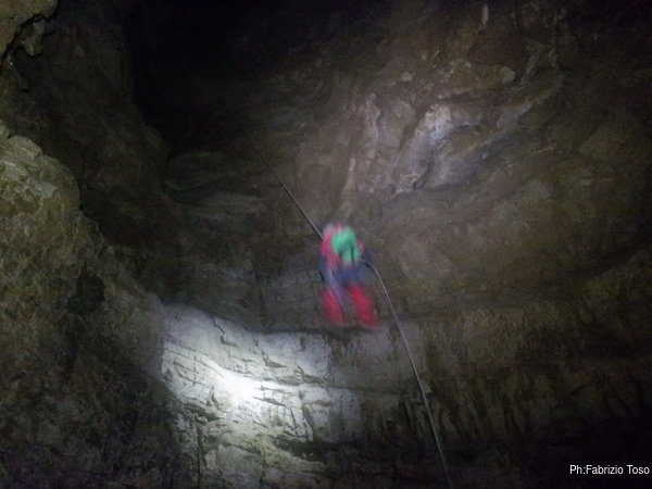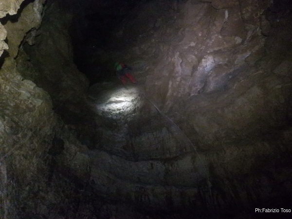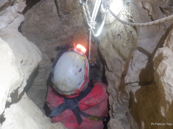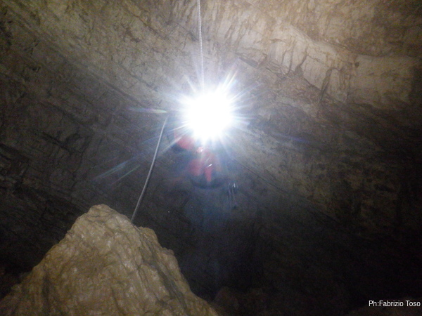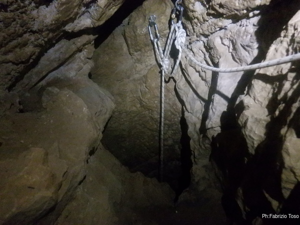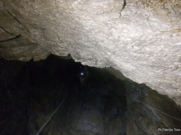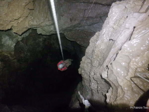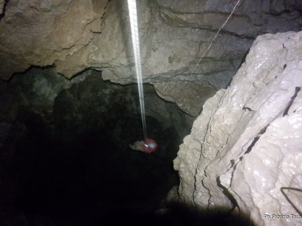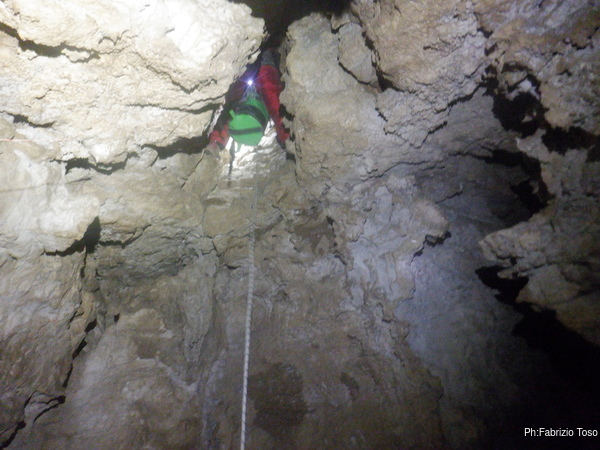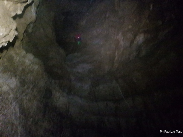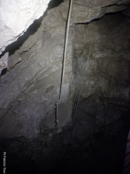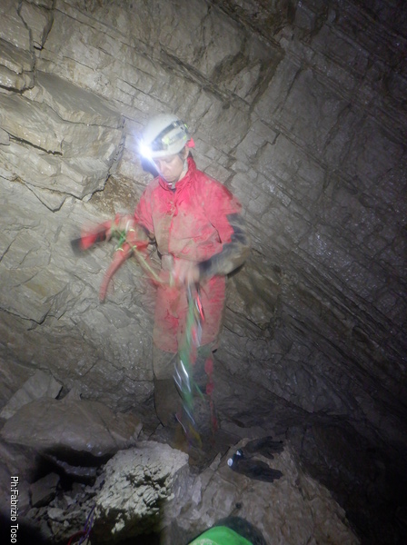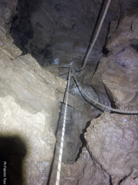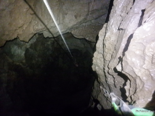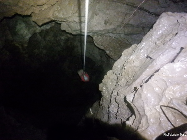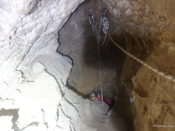 Recuperata la corda e gli attacchi necessari parto per armare il pozzo. Alessia si chiede perche’ non utilizzare le corde gia’ presenti ma illuminando meglio davanti a noi le mostro che quelle sono corde fisse che non scendono ma bensi’ vanno dall’altro lato del pozzo dove e’ in esplorazione una diramazione.