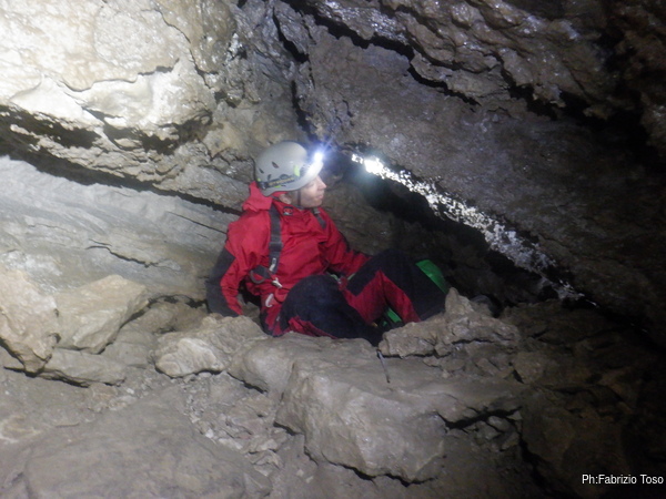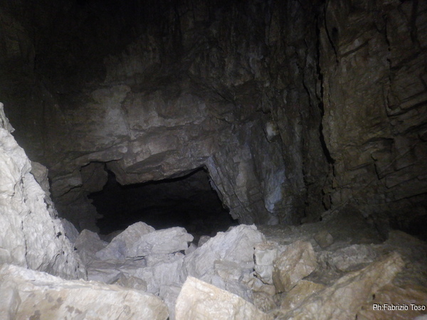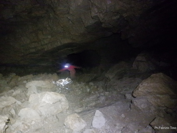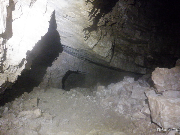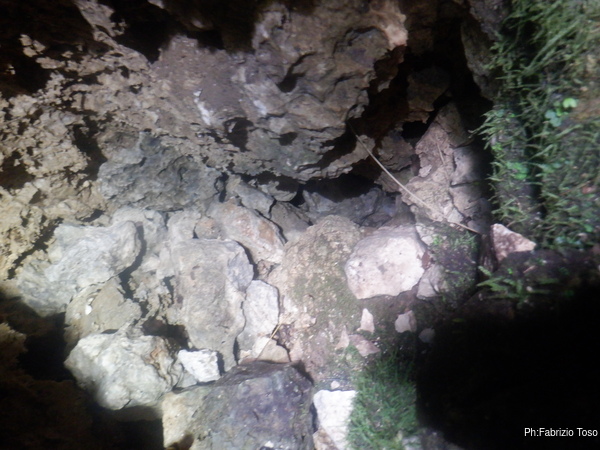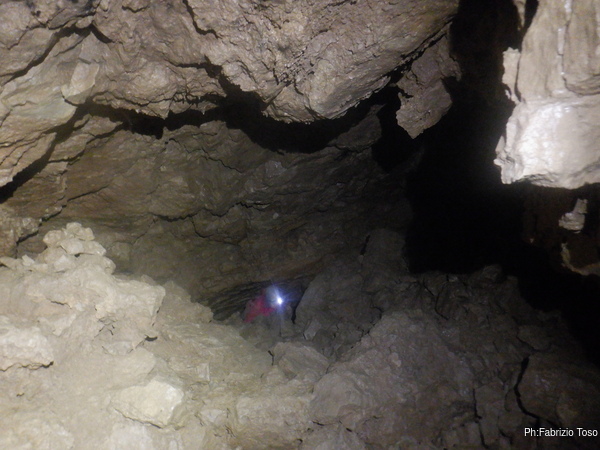 Arriviamo in un ambiente piu’ piccolo di quanto sperassimo, avanti, sempre tra massi di crollo forse si potrebbe andare avanti ma non sembra un lavoro ne’ fattibile ne’ consigliabile per via dei massi di crollo che ci sovrastano. Con un poco di delusione prendiamo la via del ritorno e ritorniamo alla galleria.