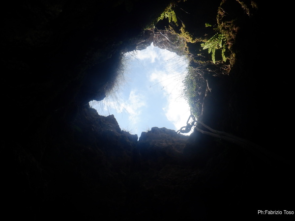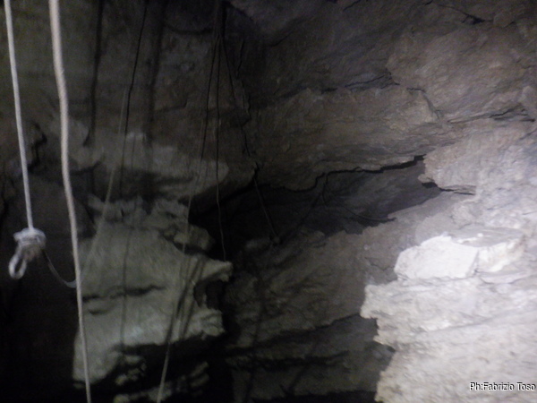 Quando sono pronto inizio a scendere e ne approfitto per una foto al “canapone”, quello che leggenda narra sia stato utilizzato dal primo esploratore, speleo improvvisato, per scendere il pozzo a forza di braccia. Naturalmente non posso esimermi dal raccontare la cosa ad Alessia, che ascolta con pazienza infinita i miei sproloqui.