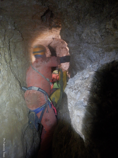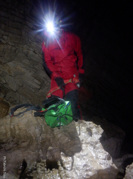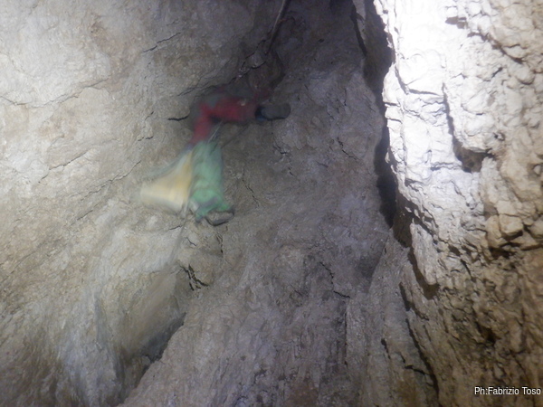 Almeno questa era l’intenzione…fatto sta che quando arrivo al passaggio strettino prima dello scivolo che porta al pozzo lascio andare lo zaino senza ricordare che non avendo indossato l’imbrago non l’ho assicurato a nulla. Lui si lascia andare allegramente e altrettanto allegramente rotola fino al bordo del pozzo e poi lo discende precipitevolissimevolmente!