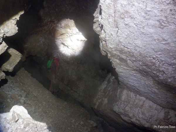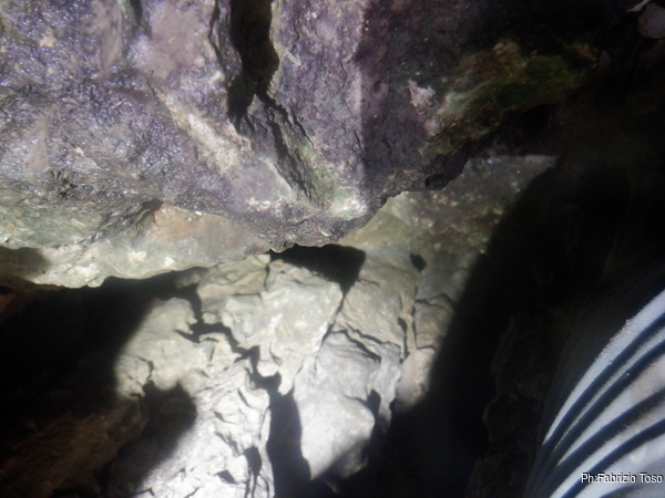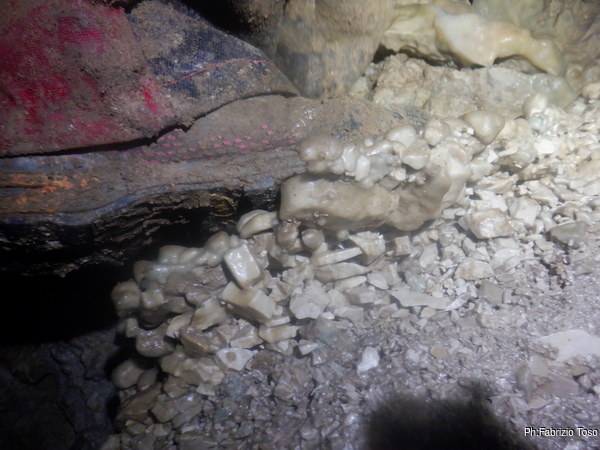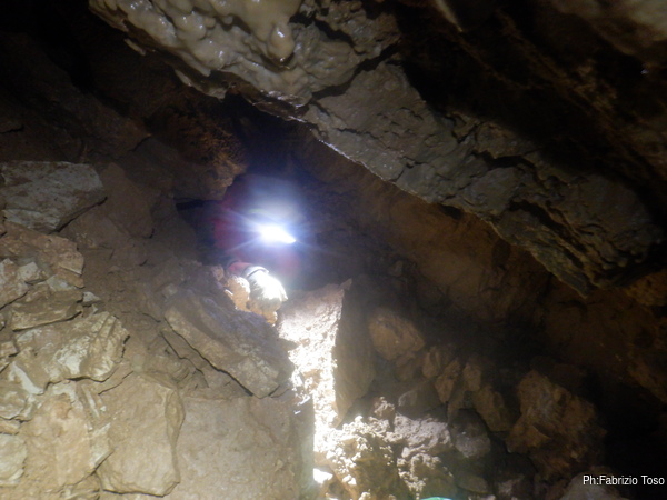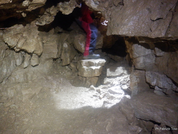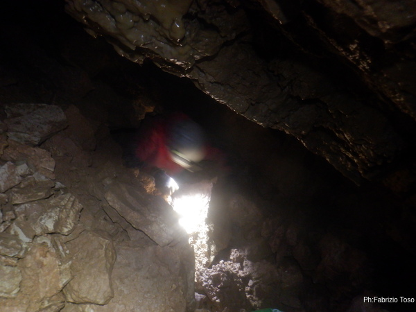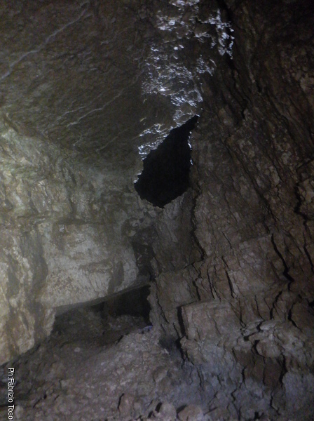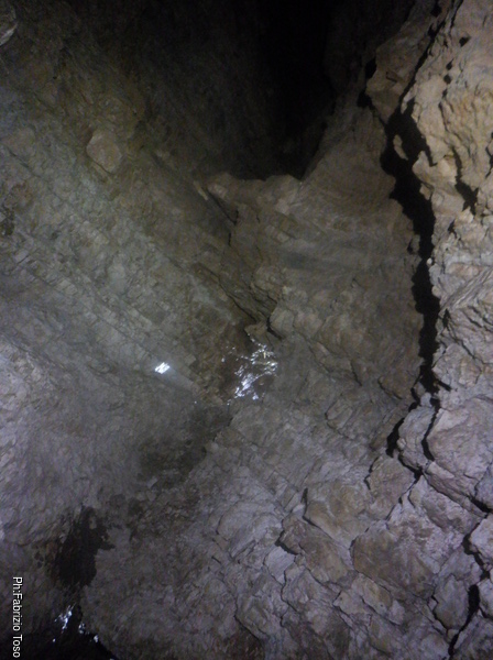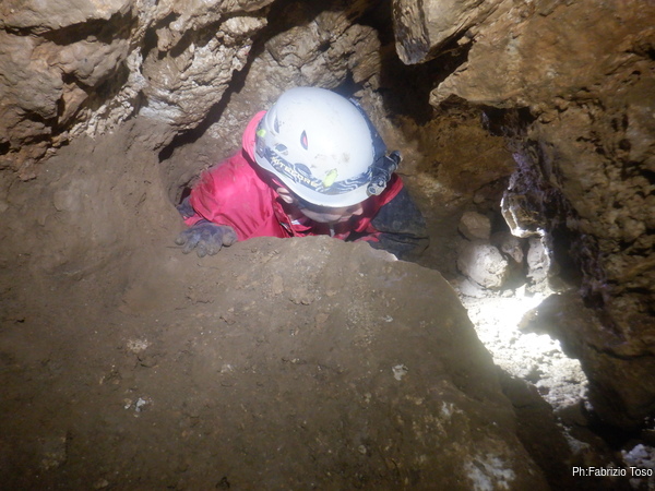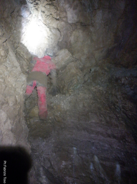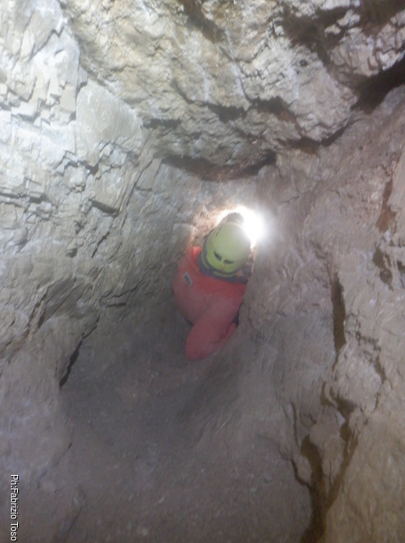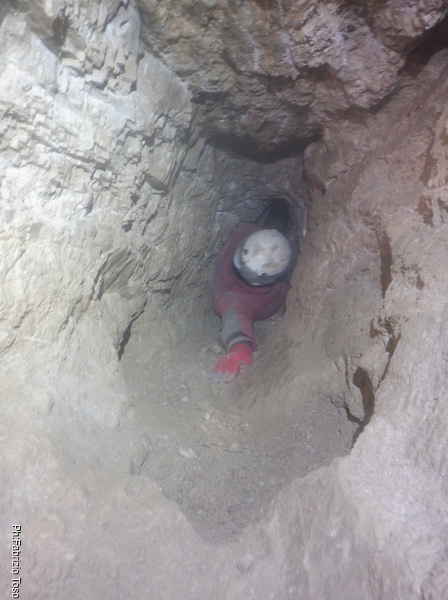 Alessia esce dal pertugio infangata ma contenta e proseguiamo la discesa. Scendo lentamente cercando possibili punti interessanti da guardare. Sulla sinistra, vicino la parete della galleria, vedo un piccolo buco che mi incuriosisce. Mi avvicino per sbirciarci dentro e trovo con sorpresa che avanti sembra esserci un piccolo ambiente a misura d’uomo.